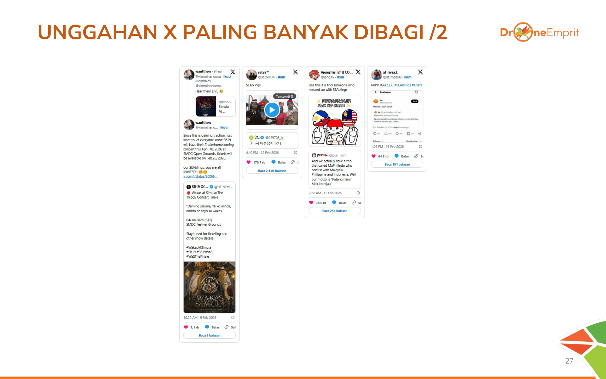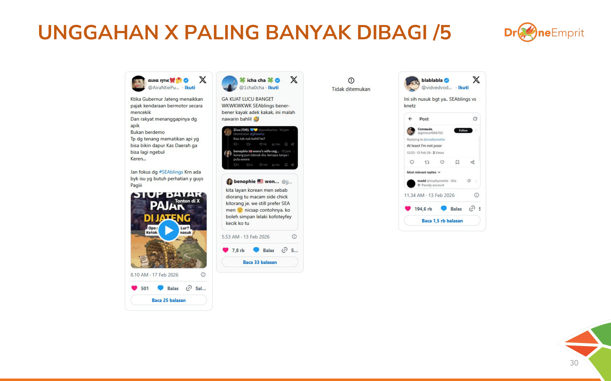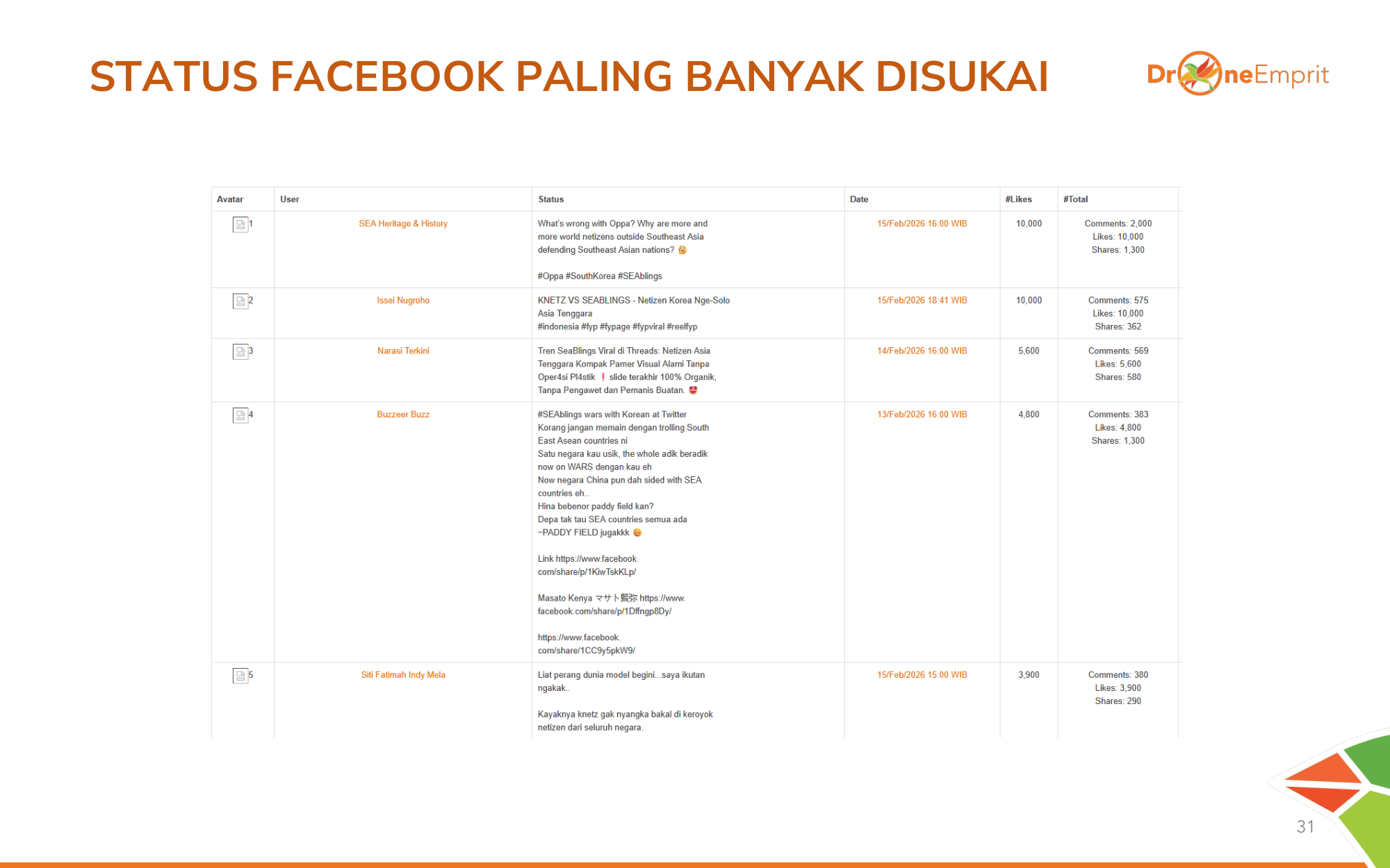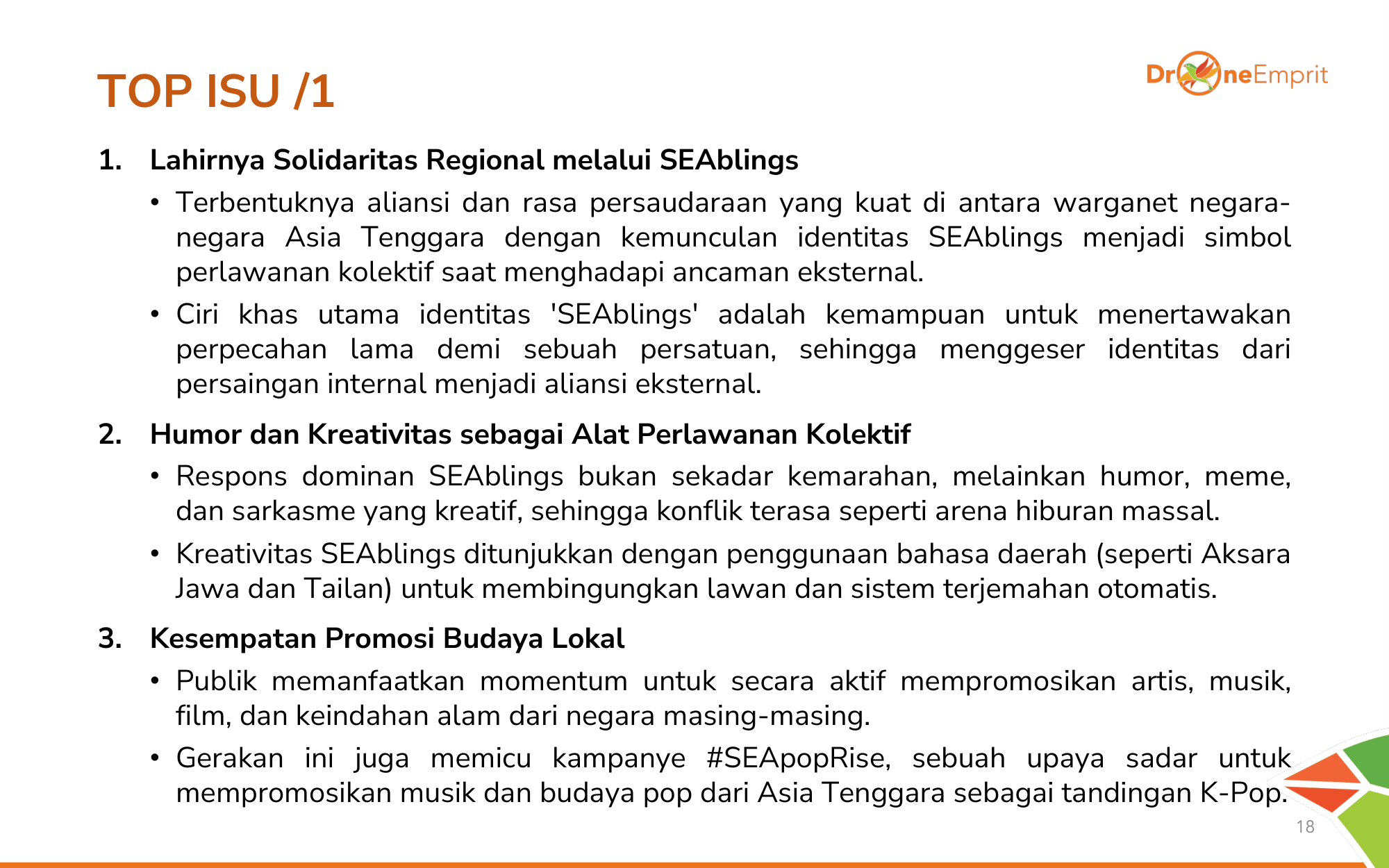 Kami memantau data dari X, FB, IG, YouTube, TikTok, dan Media Online periode 1 – 18 Feb 2026. Isunya Perseteruan Netizen se-Asia Tenggara.