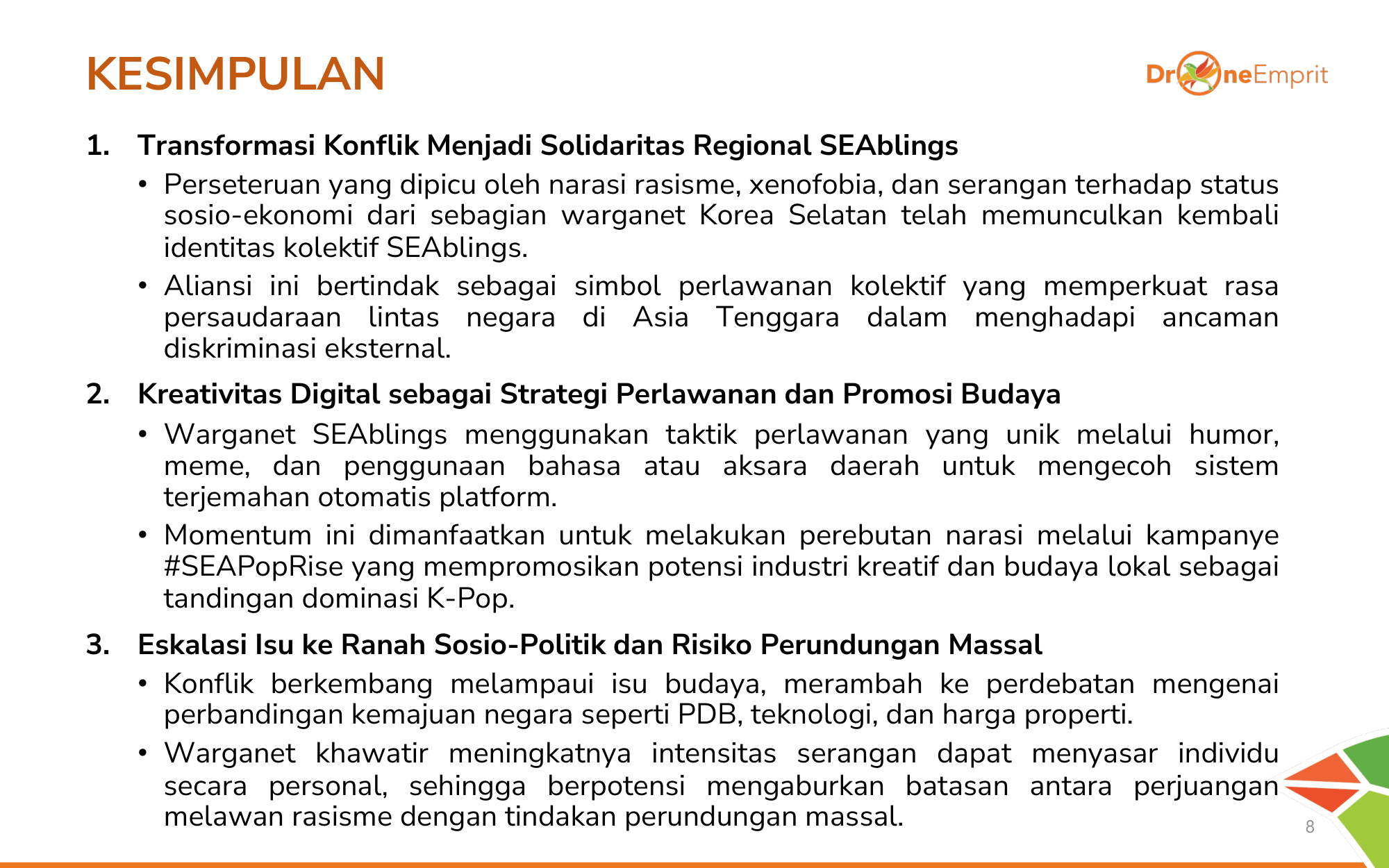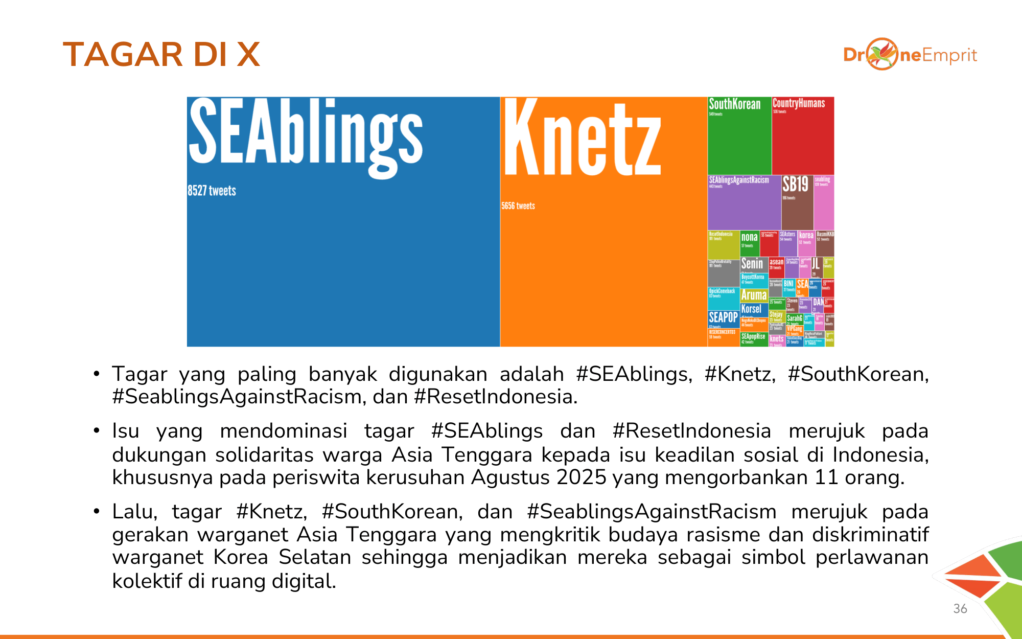 Hashtag yang menggema #SEAblings, #Knetz, #SouthKorean, #SeablingsAgainstRacism jadi simbol perlawanan kolektif terhadap standar ganda & diskriminasi digital, sementara #ResetIndonesia muncul sebagai bentuk solidaritas warga Asia Tenggara terhadap isu keadilan sosial di Indonesia (peristiwa Agustus 2025).