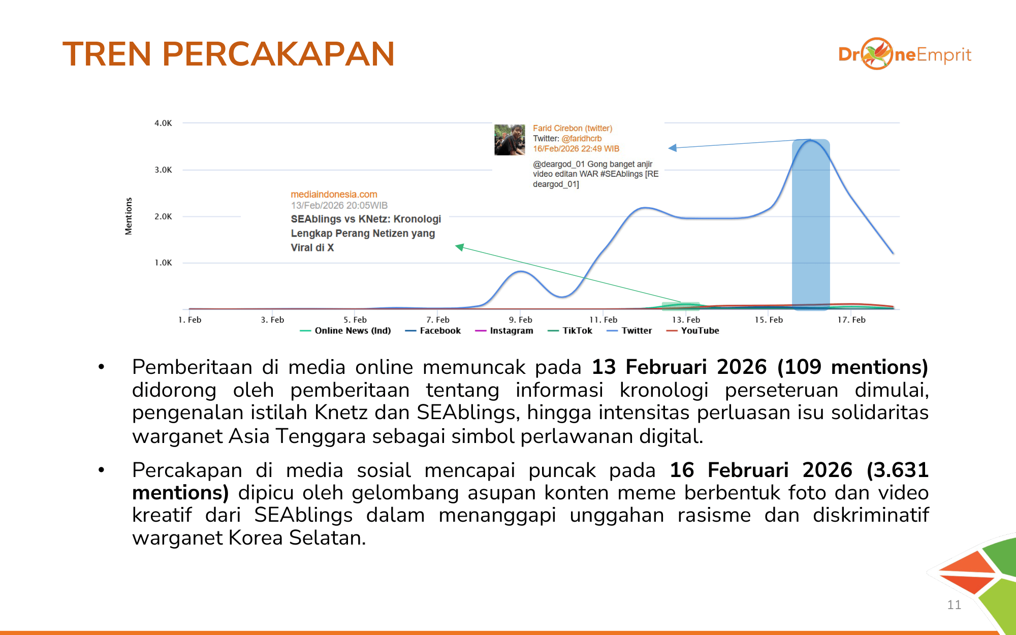 Puncak di X terjadi 16 Februari pasca unggahan rasisme, sedangkan media online memuncak 13 Februari saat istilah SEAblings mulai banyak didengungkan.