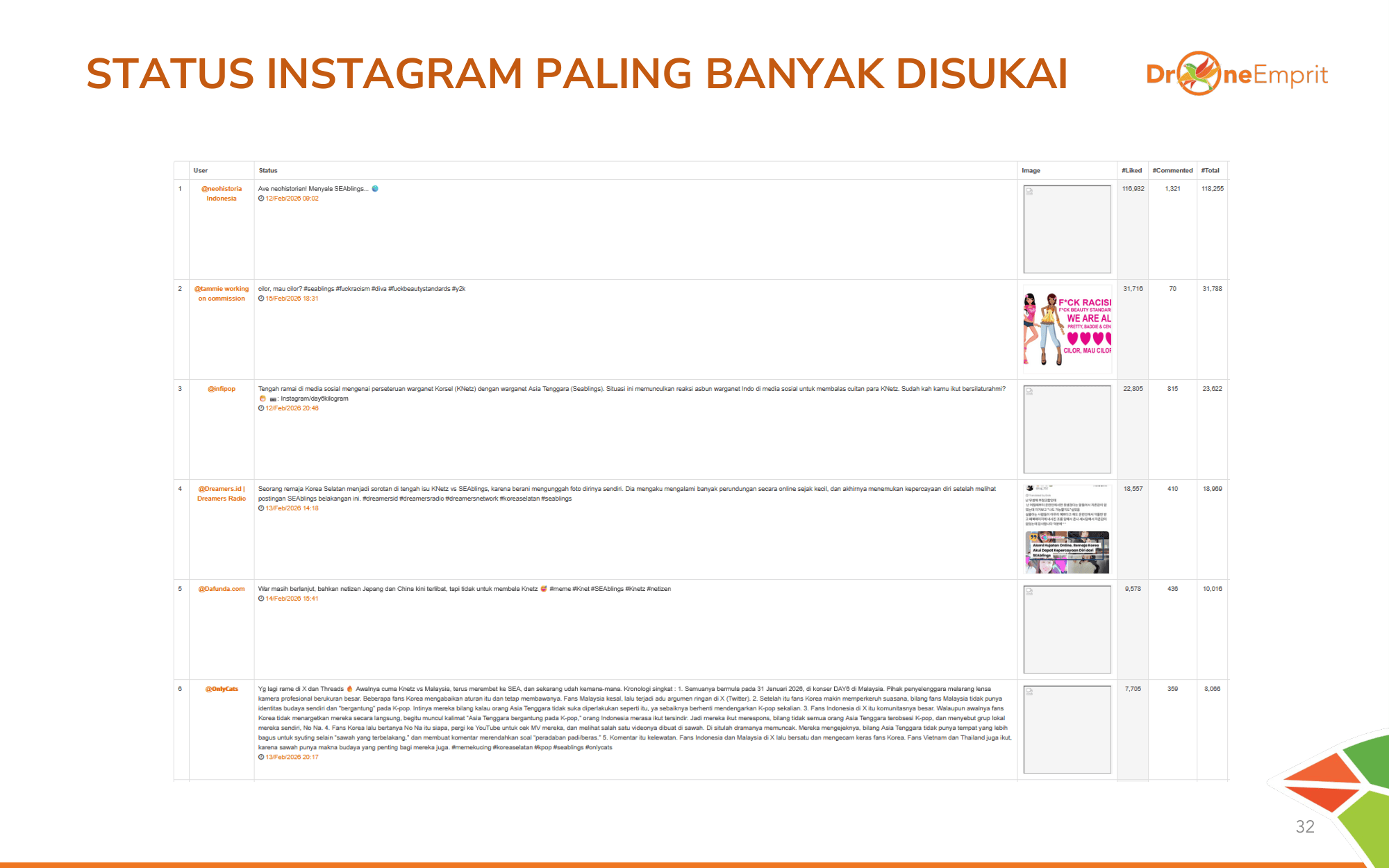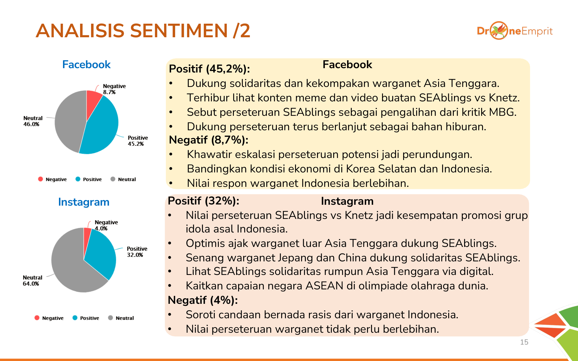 Warga FB juga lebih positif (45,2%) terhibur liat konten kreatif SEAblings. Di IG, 32% positif karena nilai perseteruan ini jadi kesempatan promosi grup idola asal Indonesia..