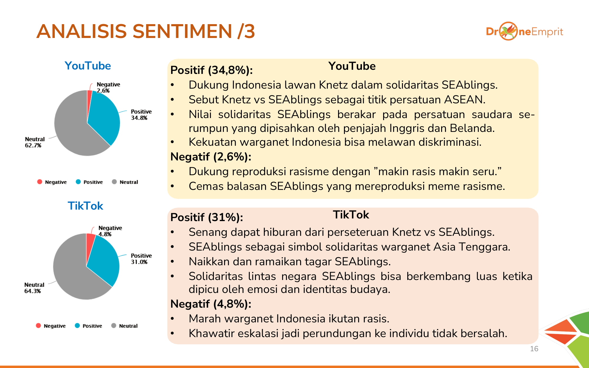 Media Online lebih netral (80,5%) namun tetap dukung SEAblings lawan diskriminasi. Sementara itu, di X warganet lebih positif (51,7%); warganet Indonesia senang banyak pihak ikut soroti masalah dalam negeri.
