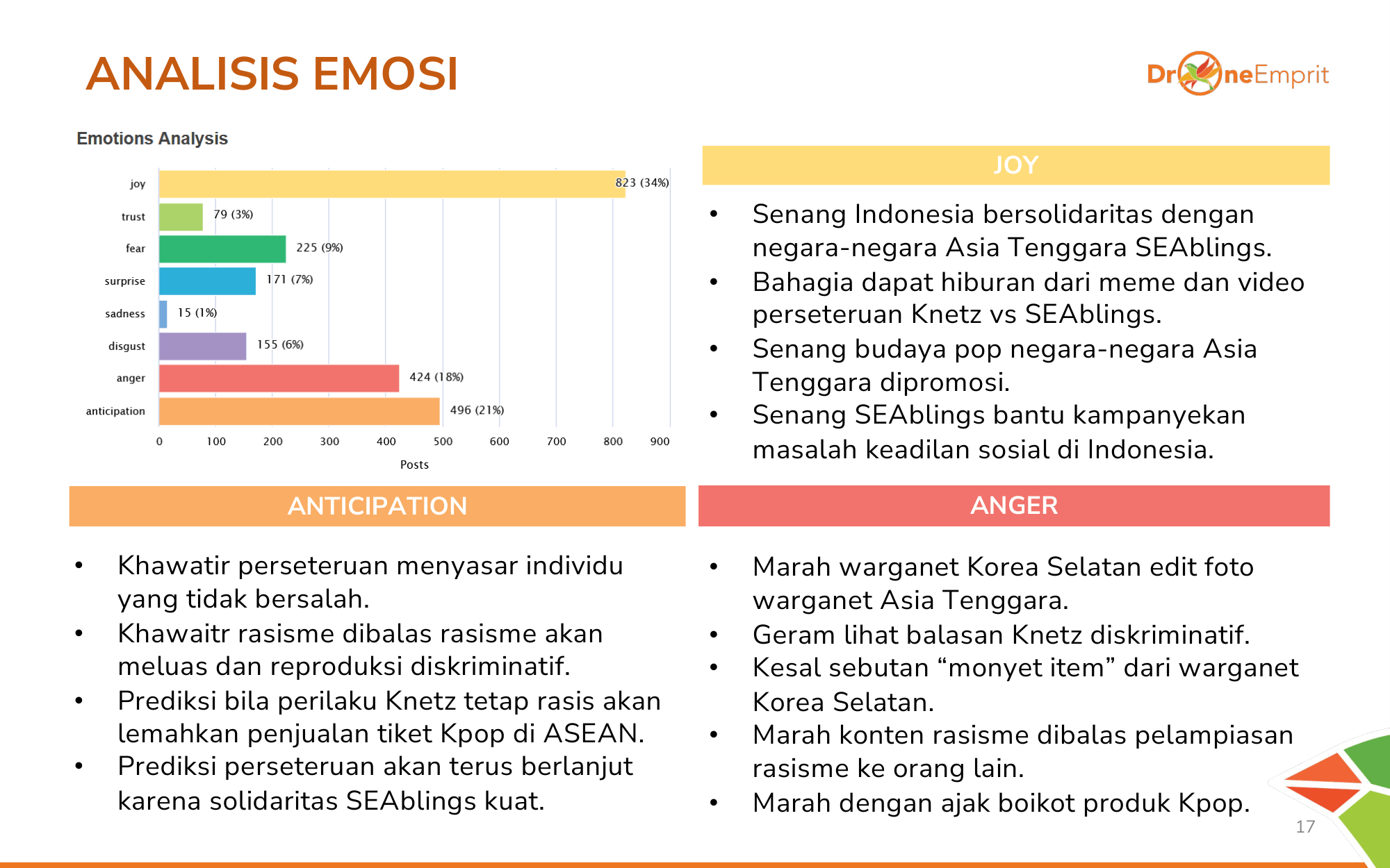 Publik penuh "Joy" (senang) karena lihat konten-konten kreatif SEAblings. Tapi muncul juga “Anticipation” dan “Anger” karena khawatir perseteruan meluas dan jadi ajang diskriminasi baru.