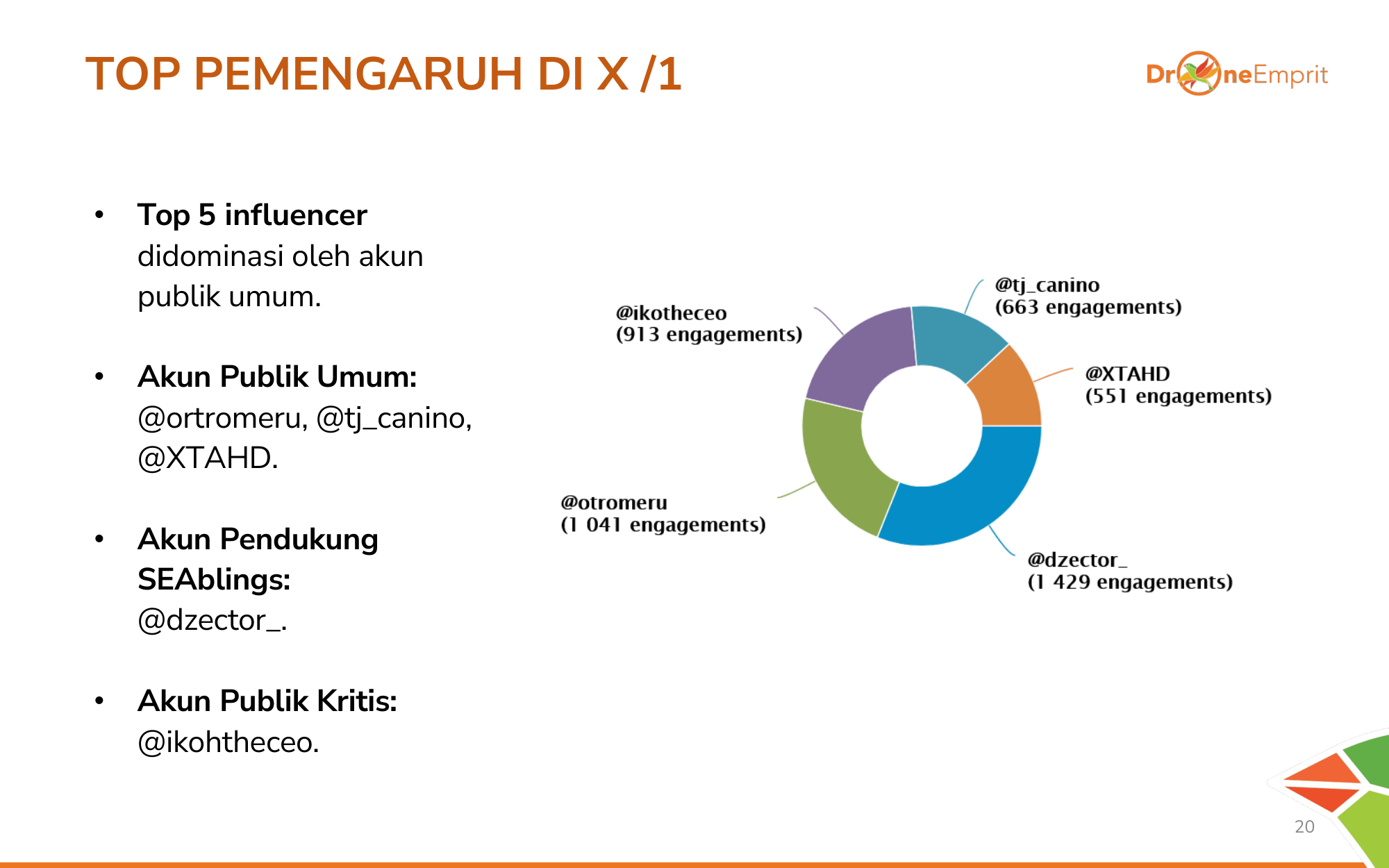 Top influencer didominasi akun publik umum seperti akun ortromeru, tj_canino, dan XTAHD. Tapi ada juga akun pendukung SEAblings yang aktif banget seperti akun dzector_