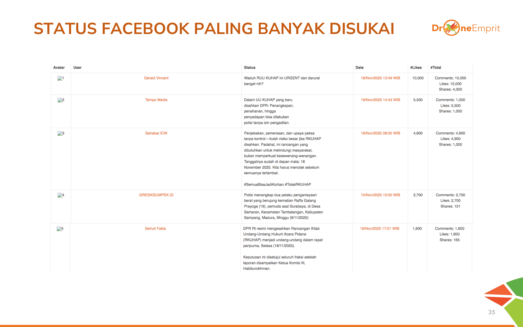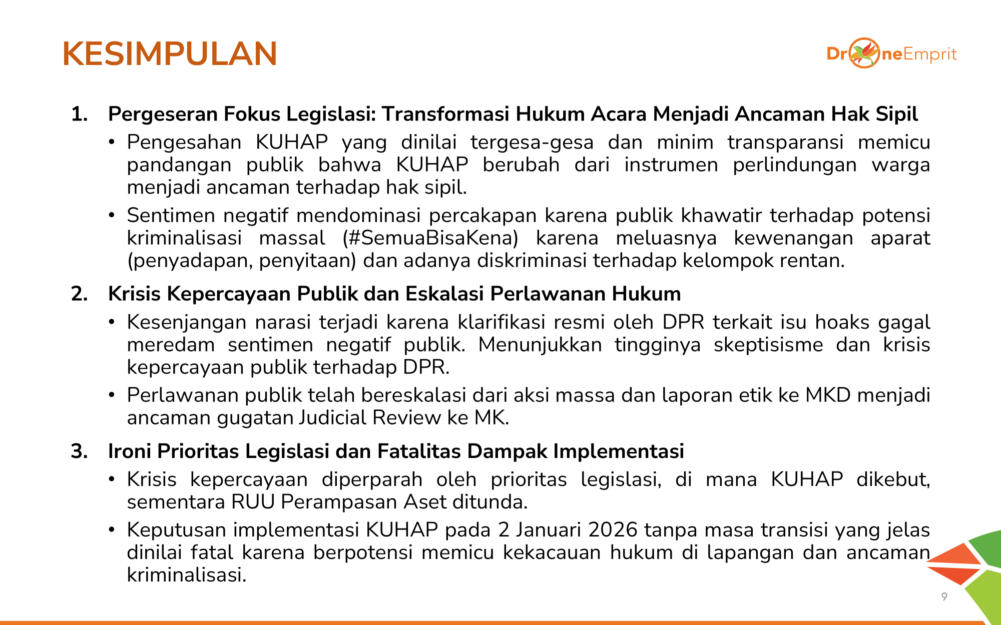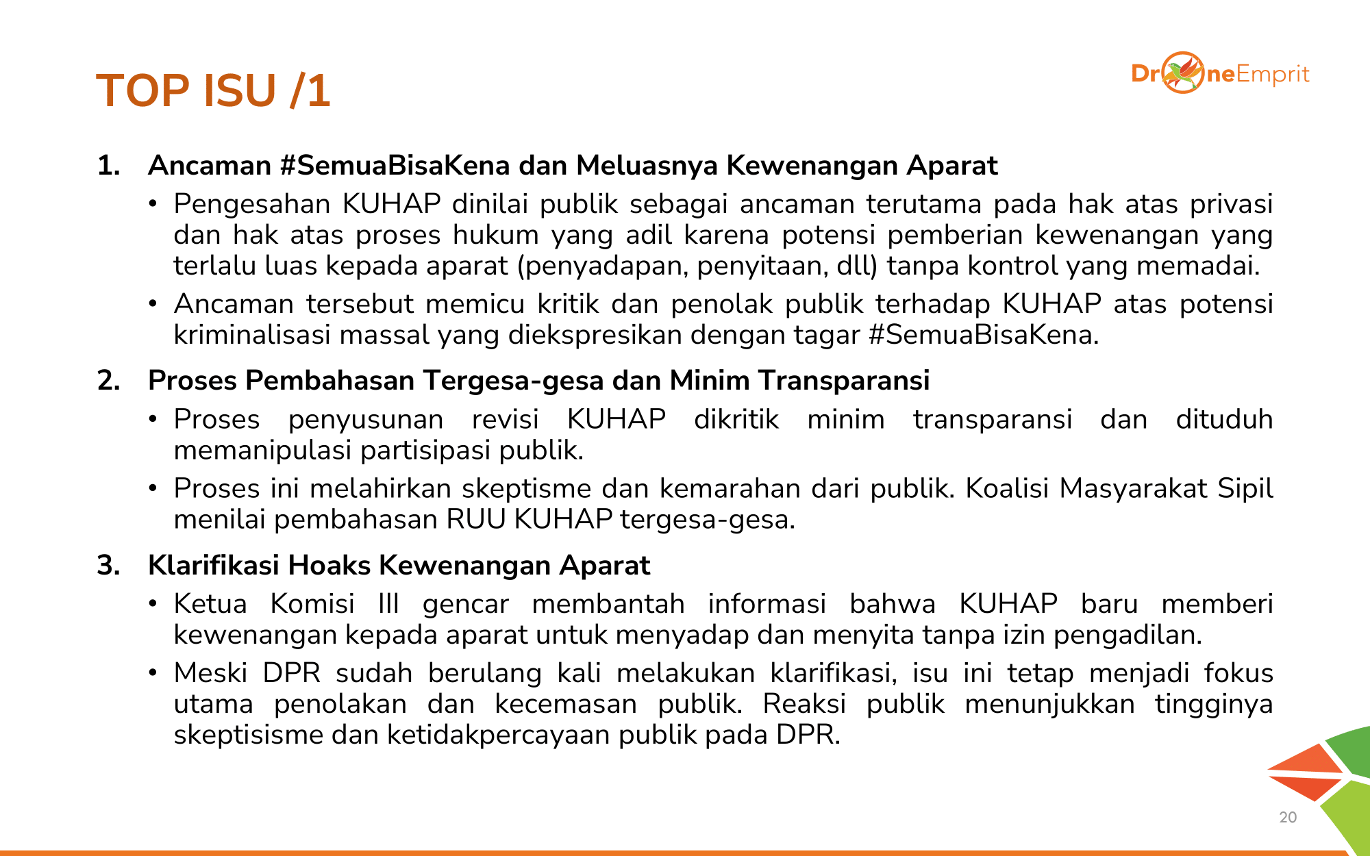 1️) Pengesahan tergesa KUHAP dinilai ancaman bagi hak sipil, memicu tagar #SemuaBisaKena & sentimen negatif.