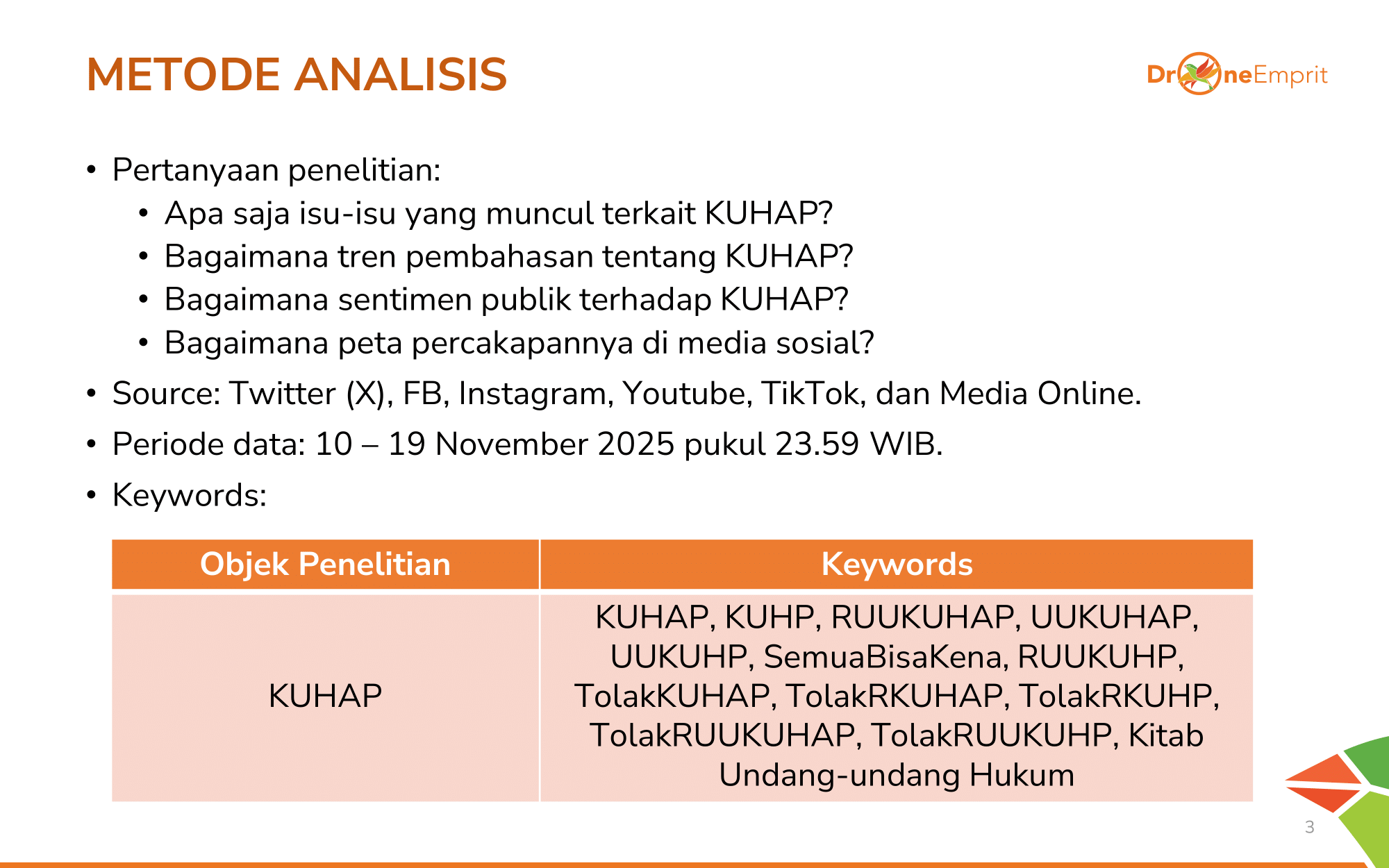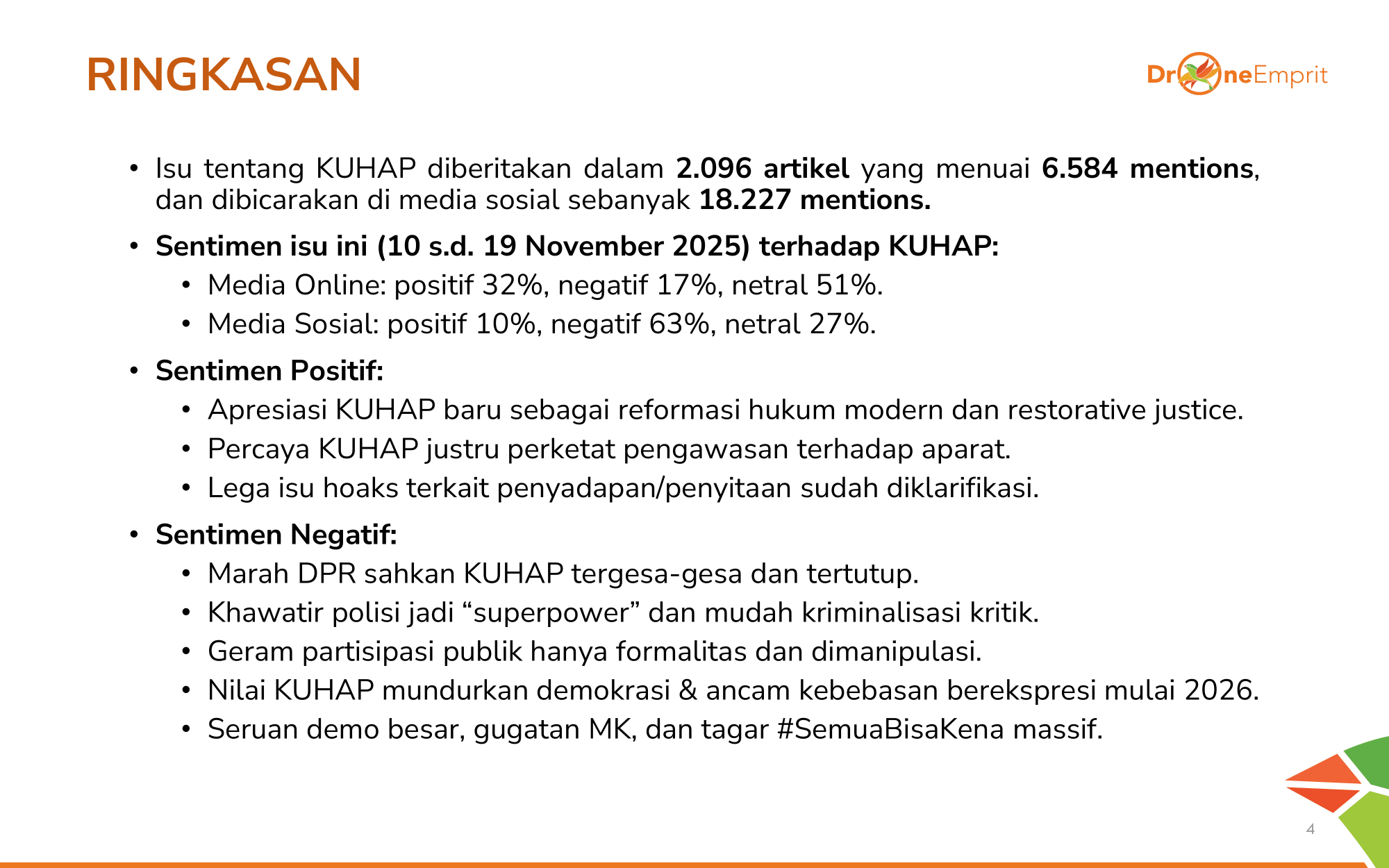 Untuk memahami sentimen publik terhadap KUHAP, kami menganalisis isu, tren, sentimen, dan peta percakapan KUHAP di media sosial & online, 10-19 Nov 2025. Dengan kata kunci seperti #KUHAP, #SemuaBisaKena, #TolakKUHAP.