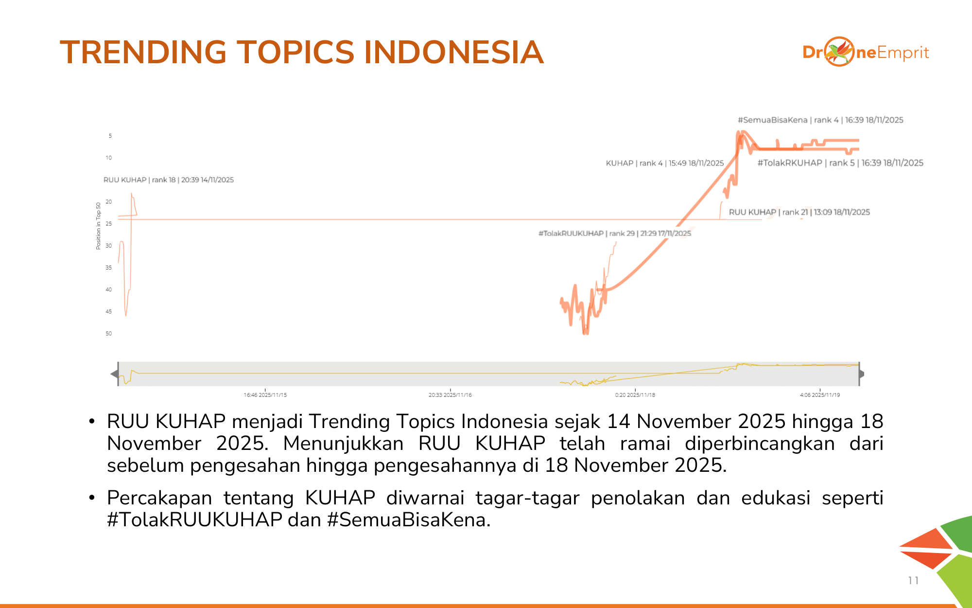 RUU KUHAP menjadi Trending Topics Indonesia selama 5 hari berturut-turut (14-18 Nov 2025), menunjukkan perhatian tinggi publik. Tagar #TolakRUUKUHAP dan #SemuaBisaKena mendominasi percakapan.