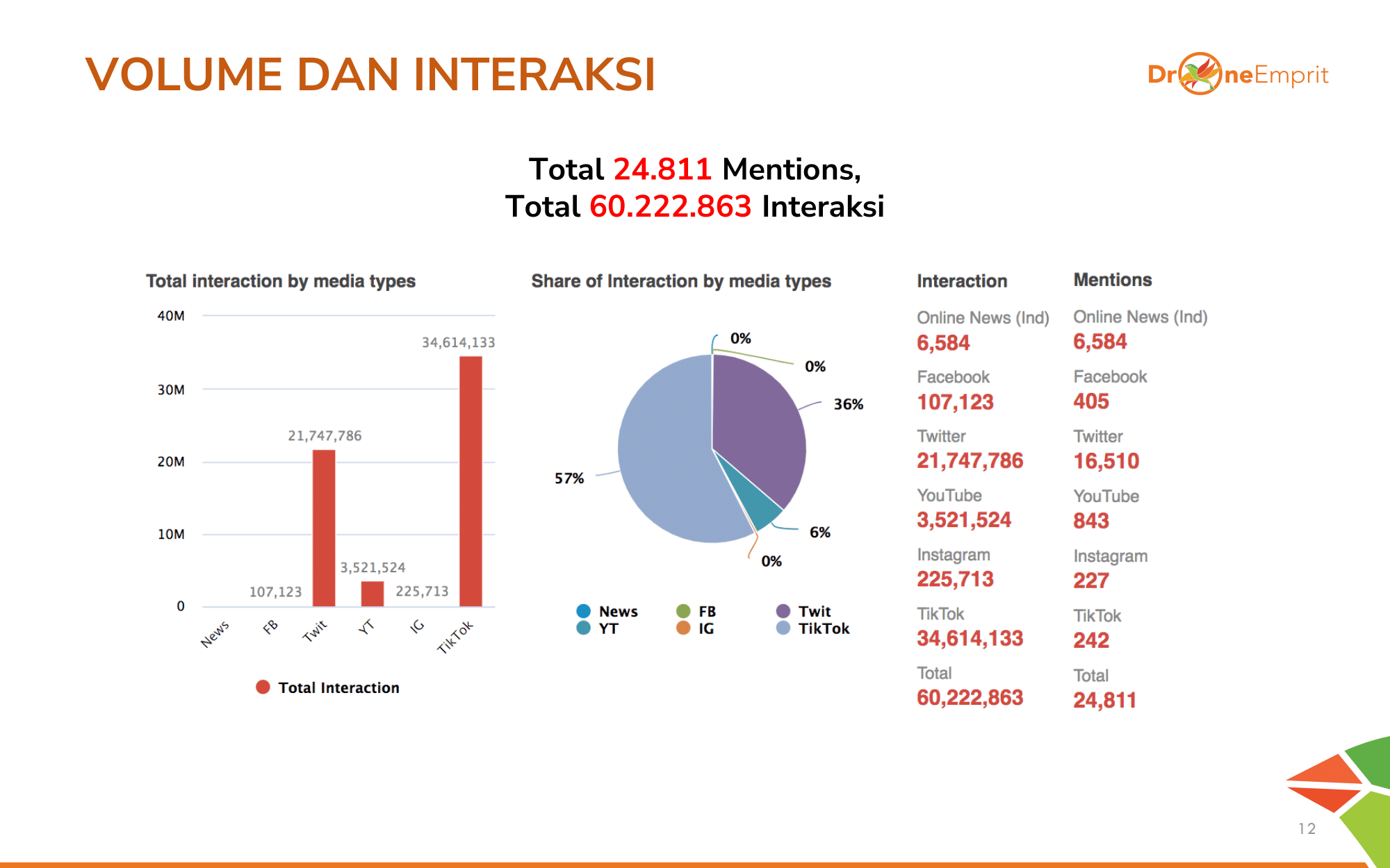 Lebih dari 24 ribu mentions dan 60 juta interaksi tercatat selama periode analisis. Mayoritas interaksi datang dari TikTok dan Twitter/X.
