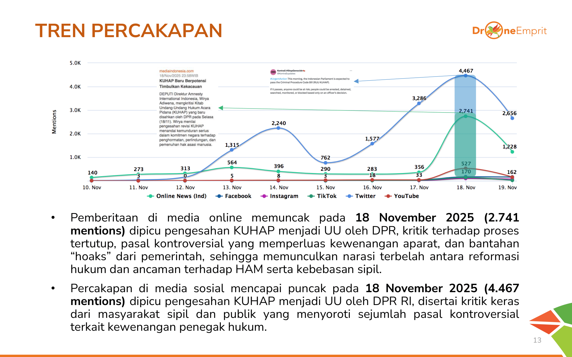 Puncak pembicaraan media online dan sosial terjadi pada 18 November 2025, tepat saat pengesahan UU KUHAP oleh DPR. Setelah pengesahan, kritik keras dari masyarakat sipil membanjiri media sosial.