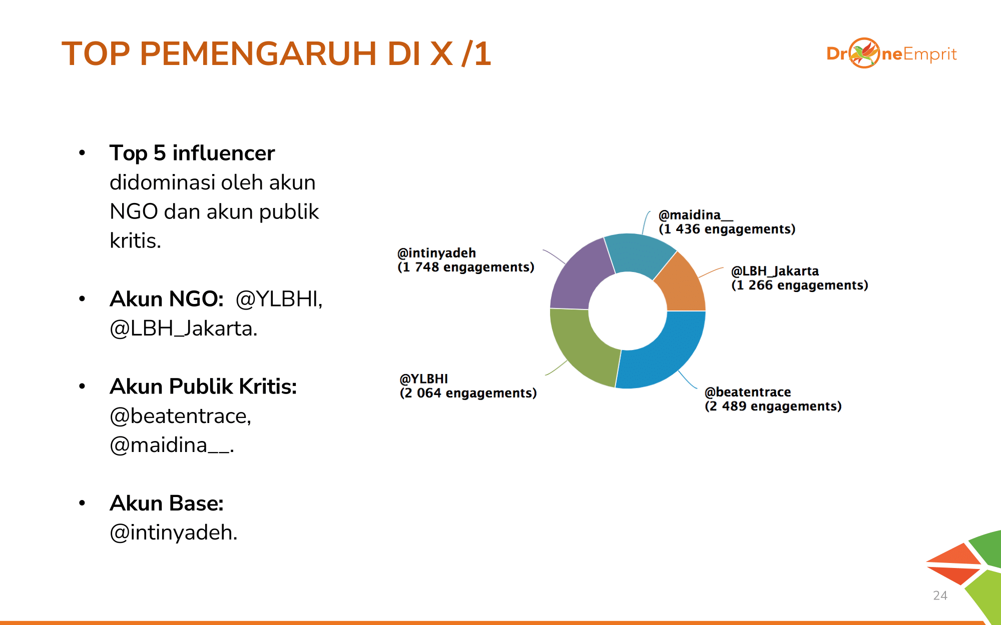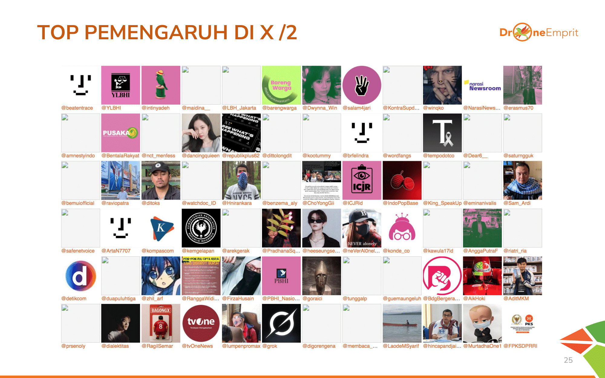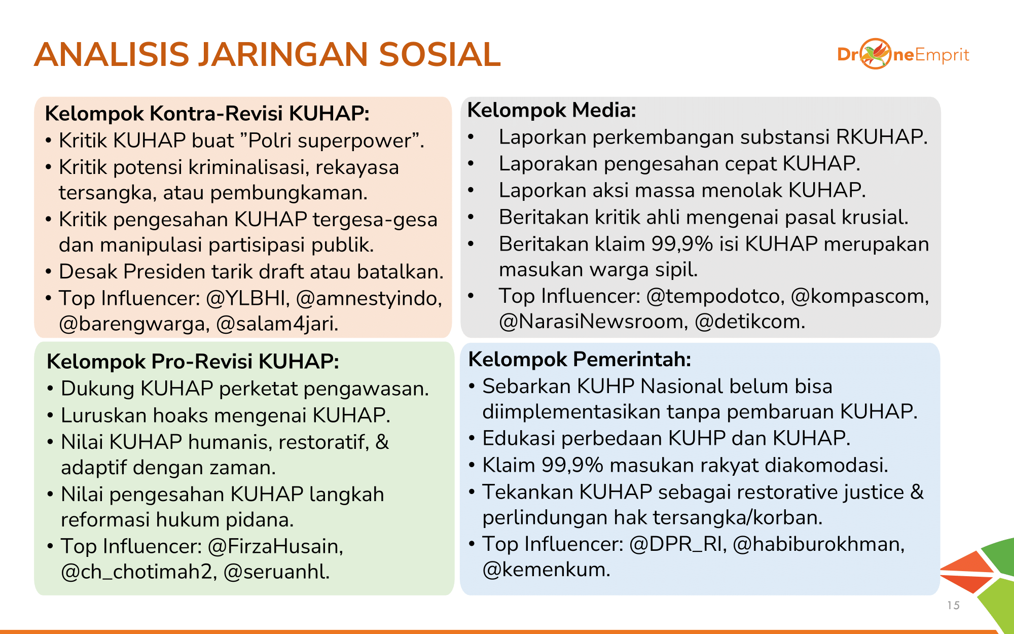 Berikut adalah akun-akun yang paling berpengaruh dalam membentuk opini publik seputar KUHAP yang terdiri dari akun NGO dan akun Publik Kritis di Platform X.