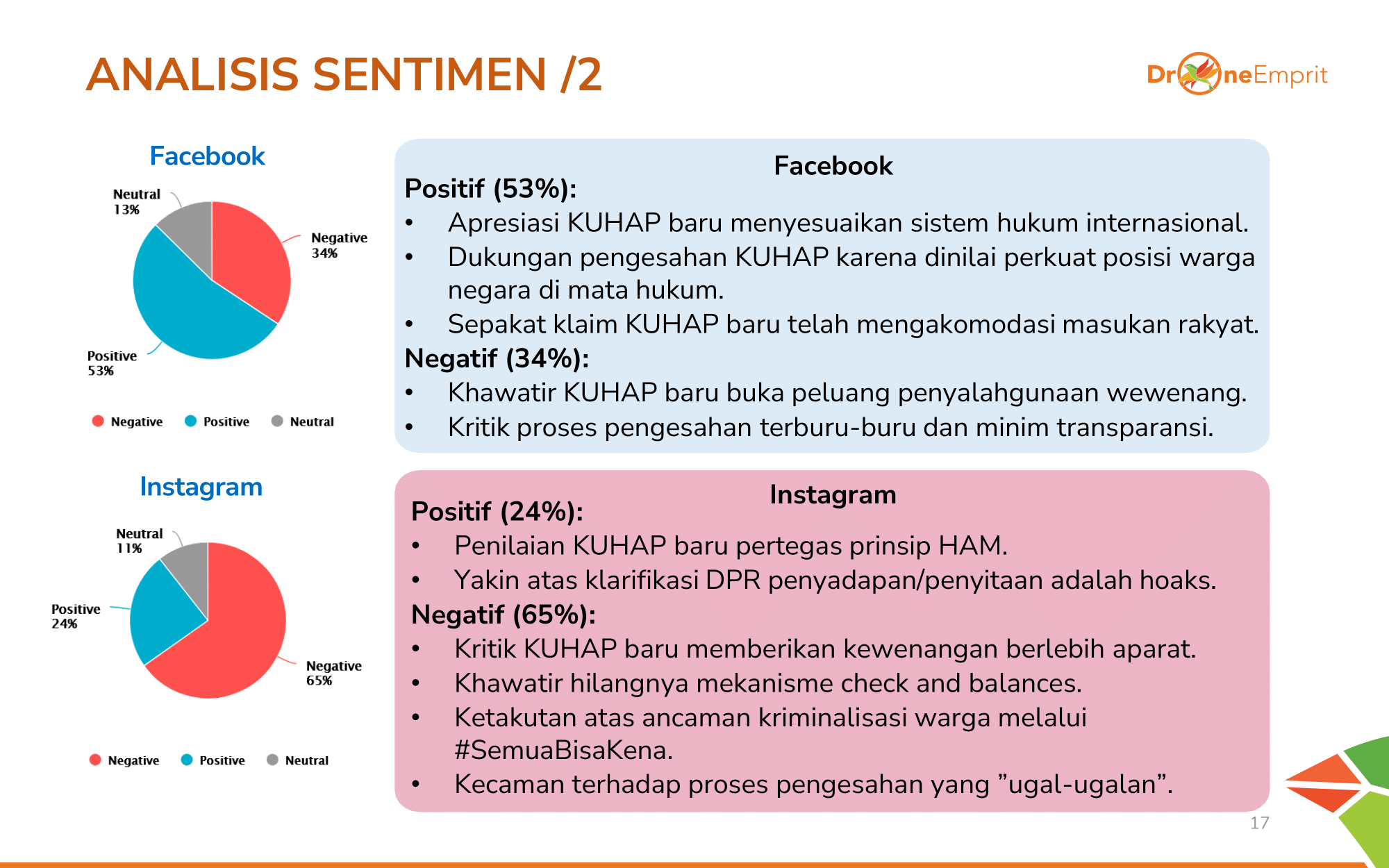 Facebook memiliki sentimen positif lebih tinggi (53%) berkat dukungan perkuatan warga negara. Instagram (negatif 65%) lebih khawatir kewenangan berlebih & hilangnya check and balances.