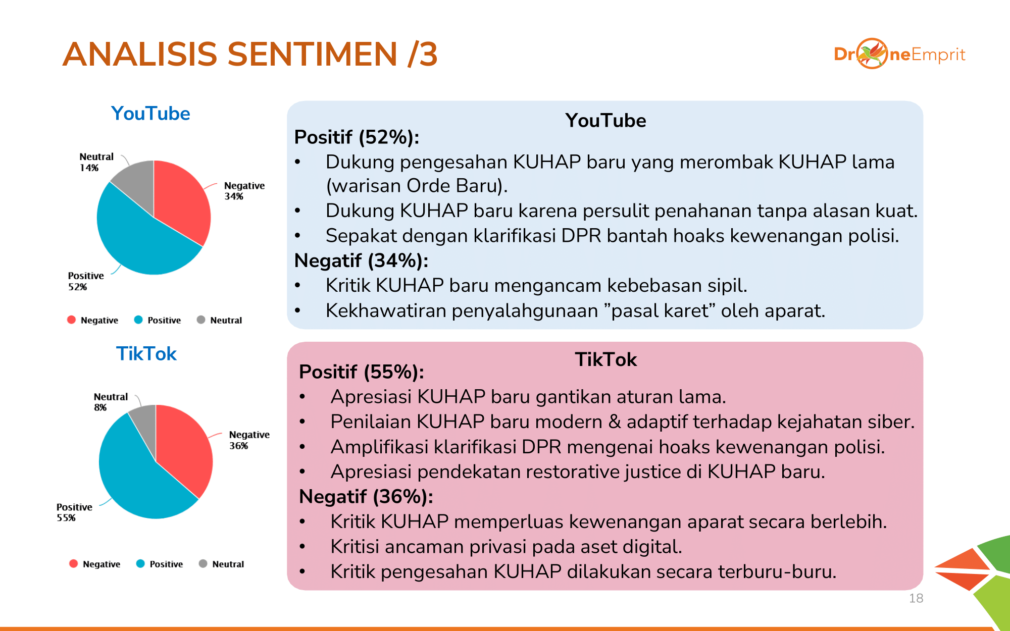 Di YouTube (positif 52%) dan TikTok (positif 55%), narasi dukungan KUHAP sebagai reformasi & pengganti UU lama cukup kuat, juga amplifikasi klarifikasi hoaks. Namun, kekhawatiran ancaman privasi & penyalahgunaan "pasal karet" tetap ada.