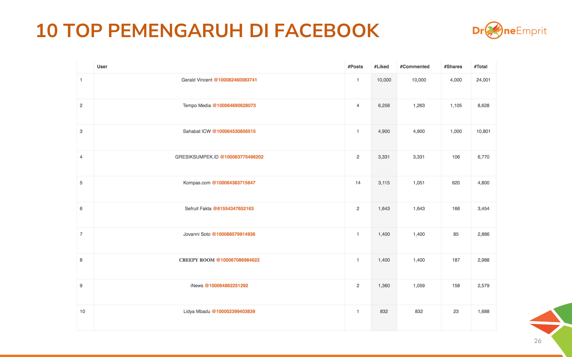 Di Facebook, percakapan didominasi oleh media (Tempo, Media), akun NGO (Sahabat ICW), dan akun personal dengan sentimen yang bervariasi.