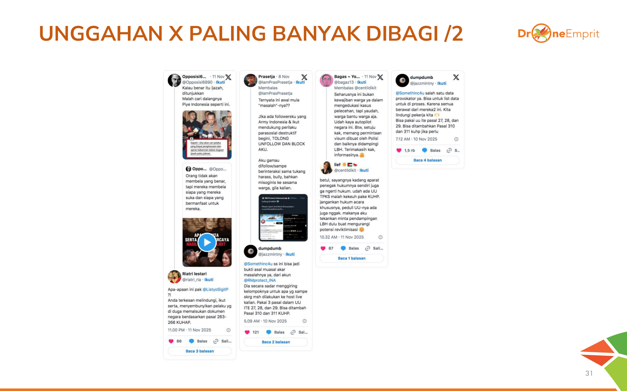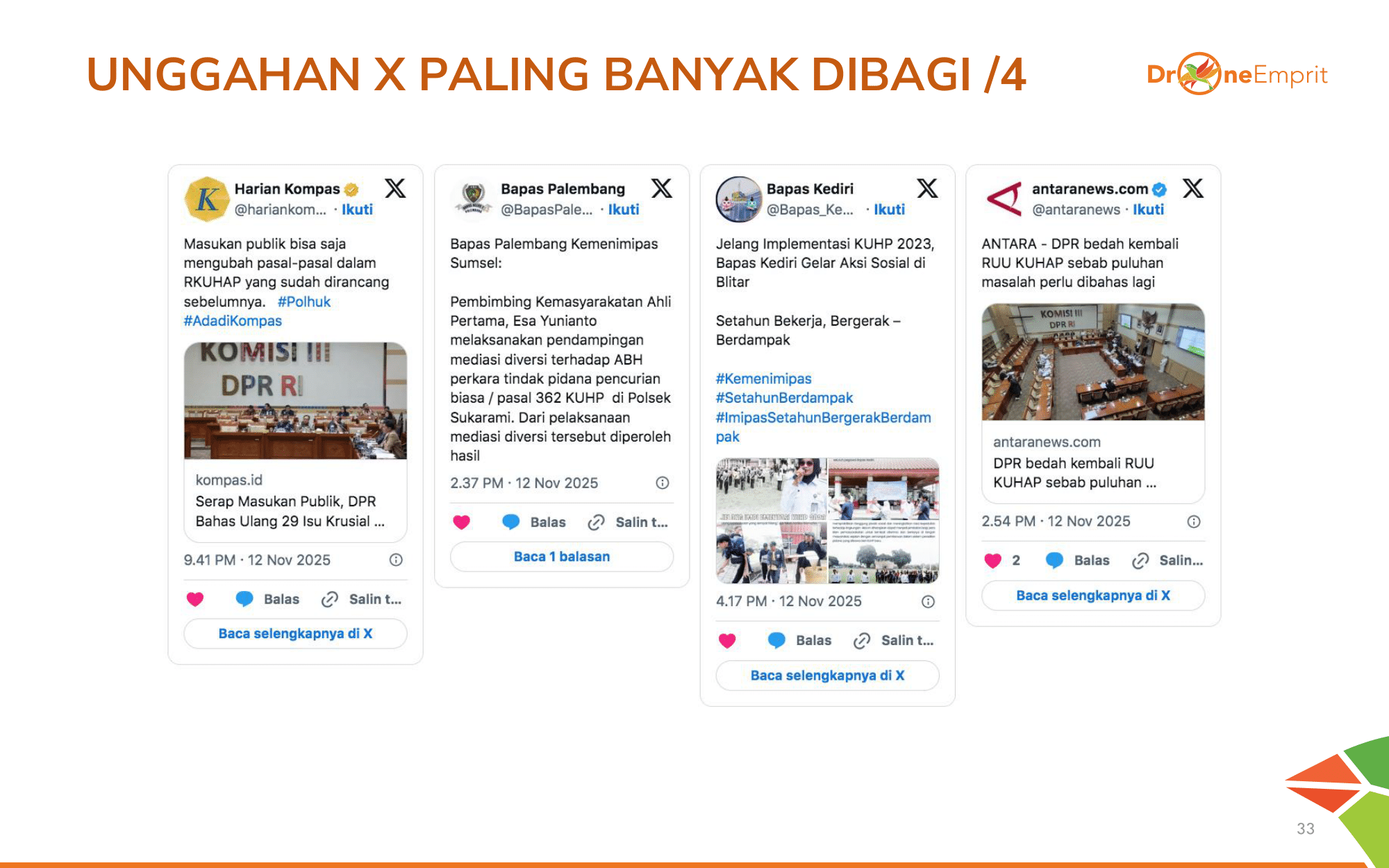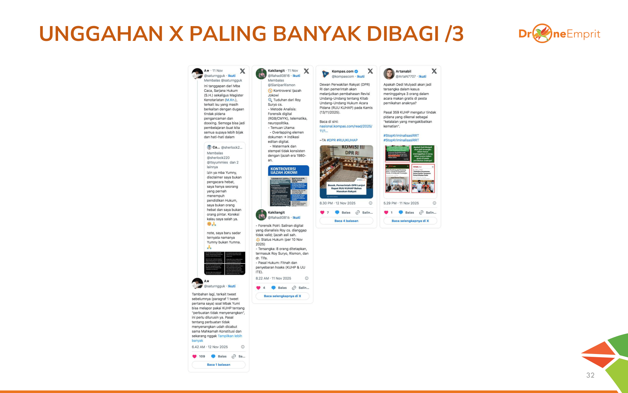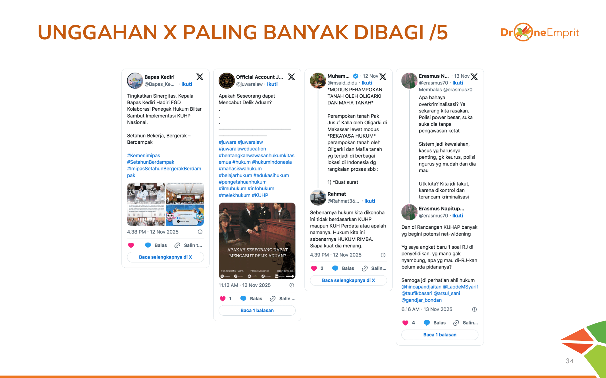 Unggahan populer selanjutnya di X menyoroti kecemasan publik terhadap RUU KUHAP: potensi kriminalisasi overkriminalisasi, penyalahgunaan wewenang aparat, hingga ancaman net-widening pada pasal penyelidikan.