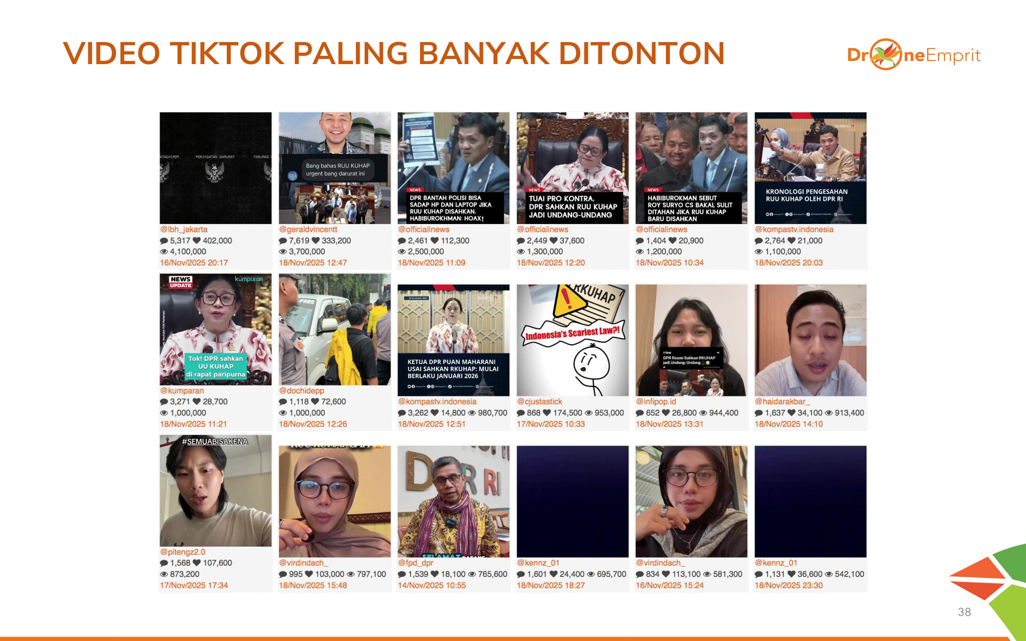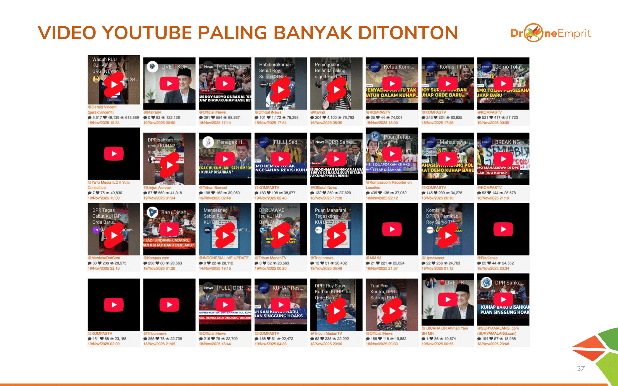 Di YouTube, video dengan jumlah tontonan tertinggi membahas isu ini dari berbagai sudut. Mulai dari laporan berita formal, klarifikasi pernyataan anggota DPR, hingga liputan proses pengesahan RUU KUHAP menjadi UU.