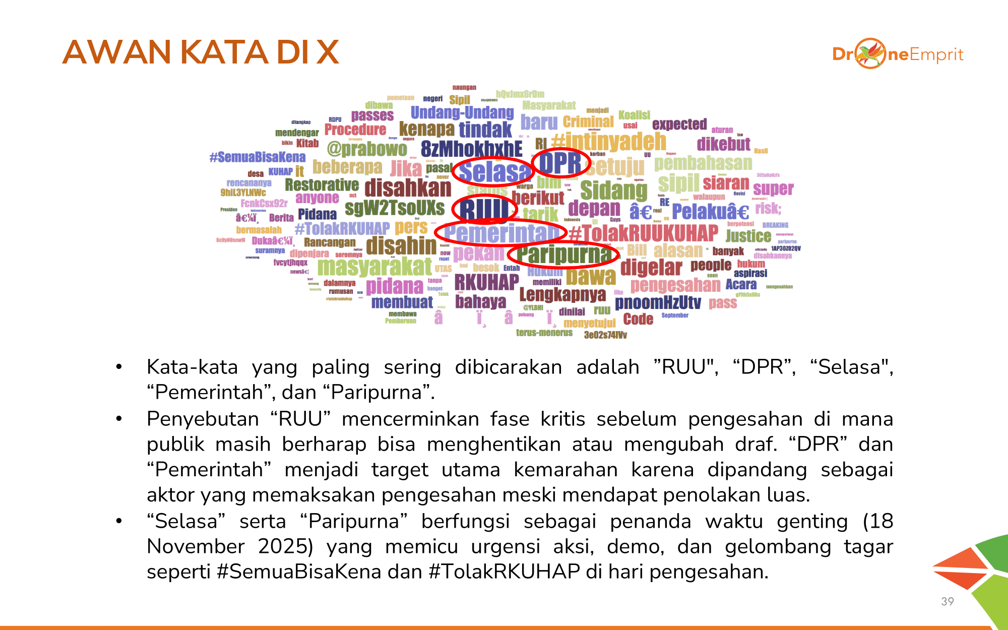 Awan kata di X memperlihatkan dominasi kata seperti RUU, DPR, Selasa, Pemerintah, dan Paripurna. Pola ini menunjukkan bahwa publik berfokus pada momen kritis 18 November dan menilai DPR sebagai pihak yang memaksakan pengesahan tersebut.