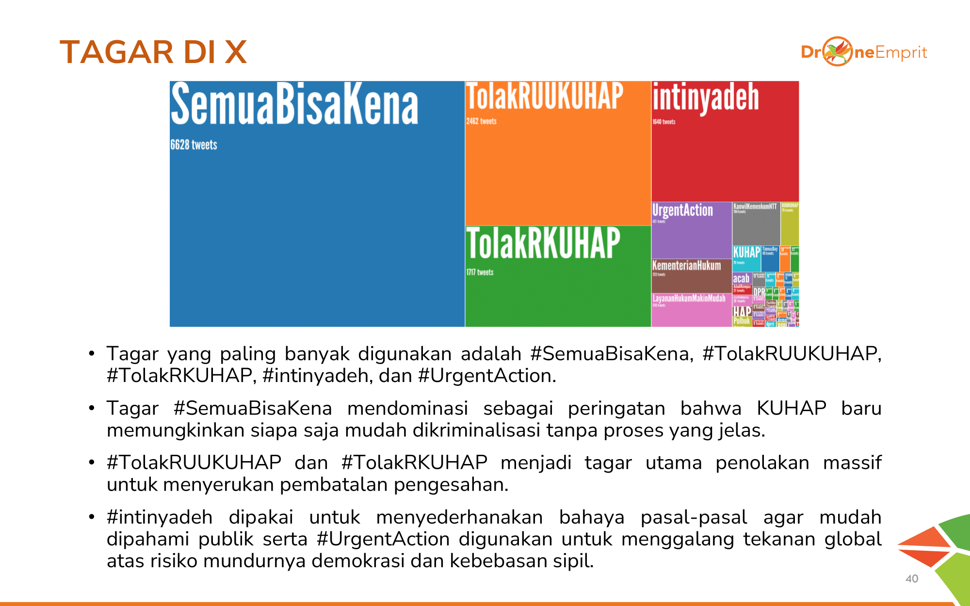 Tagar #SemuaBisaKena, yang paling banyak disorot publik dalam isu KUHAP, menjadi simbol ketakutan kolektif bahwa siapa pun dapat dikriminalisasi. Setelah itu muncul tagar lain seperti #TolakRKUHAP, #TolakRUUKUHAP, #intinyadeh, dan #UrgentAction.