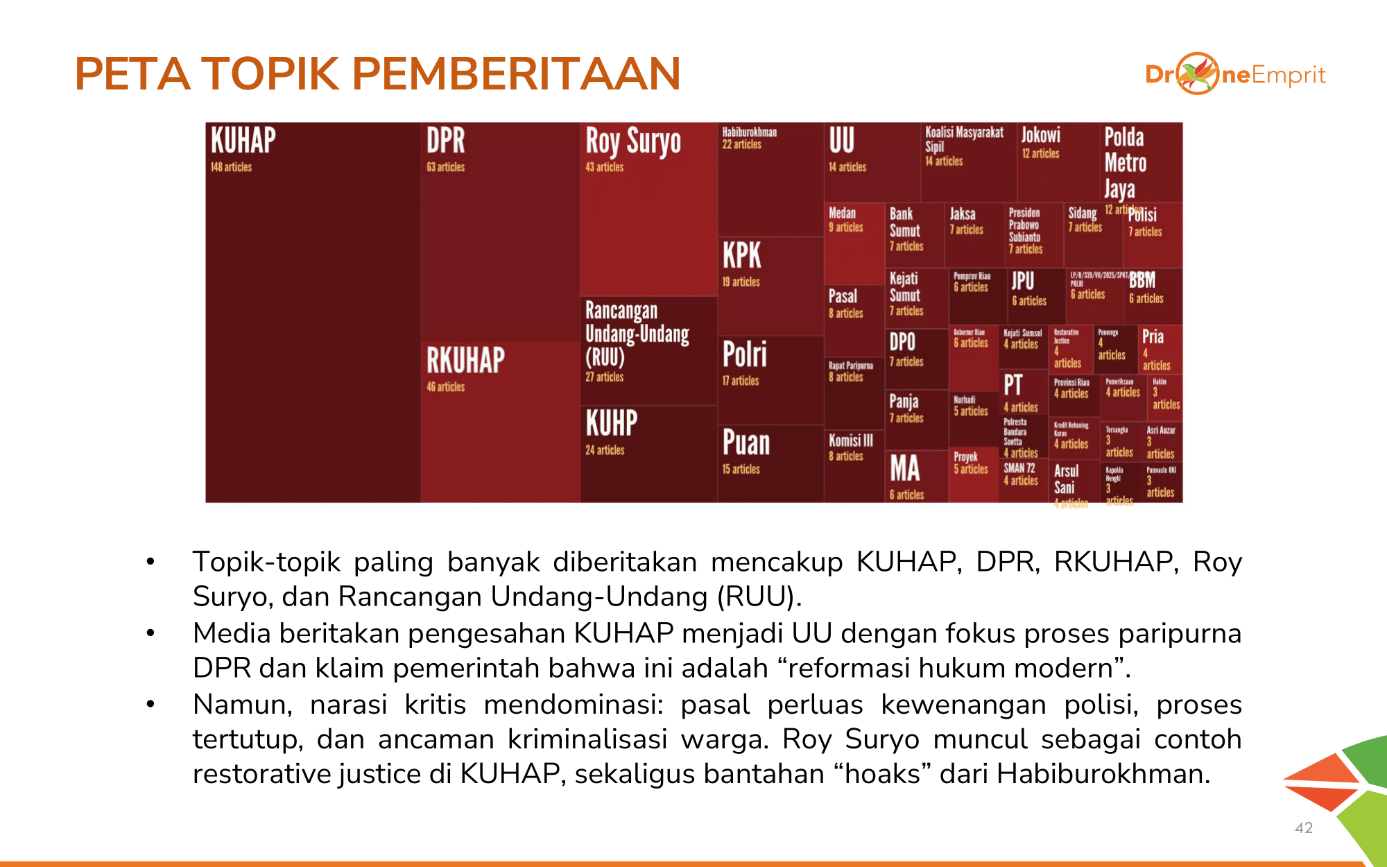 Media pemberitaan paling banyak bahas proses paripurna DPR, klaim “reformasi hukum modern” dari pemerintah, pasal kontroversial polisi, dan contoh Roy Suryo sebagai “restorative justice”.
