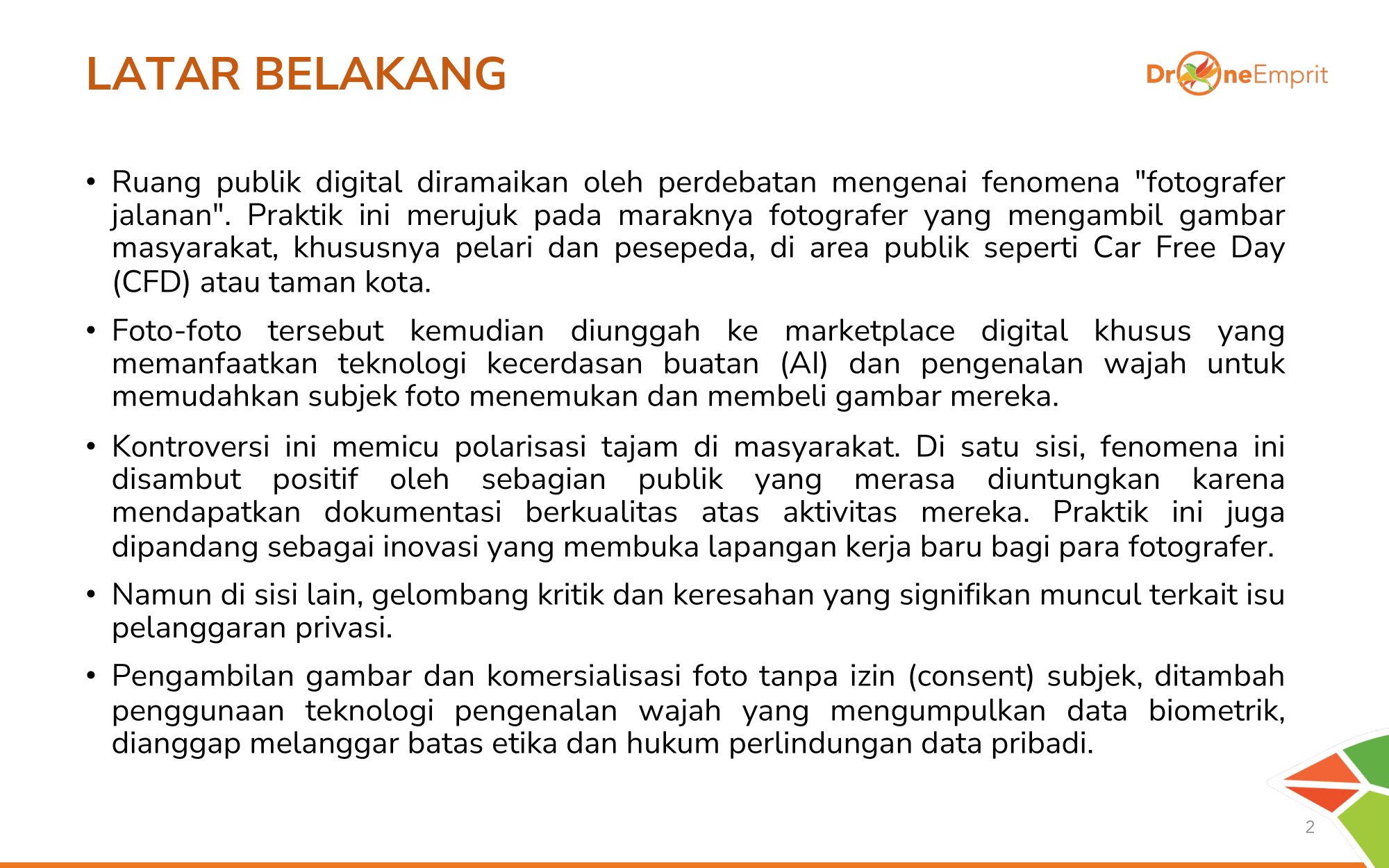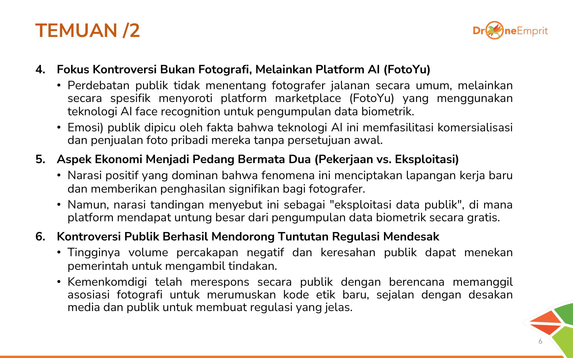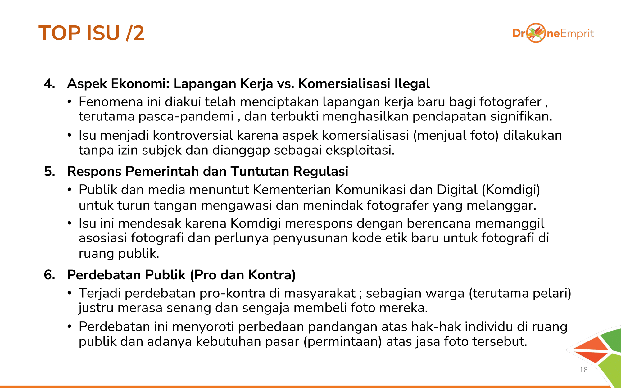 Isu lainnya: 4) Aspek Ekonomi (lapangan kerja vs. eksploitasi data); 5) Tuntutan Regulasi (desakan agar Komdigi buat kode etik); 6) Perdebatan Publik (hak fotografer vs. hak publik).