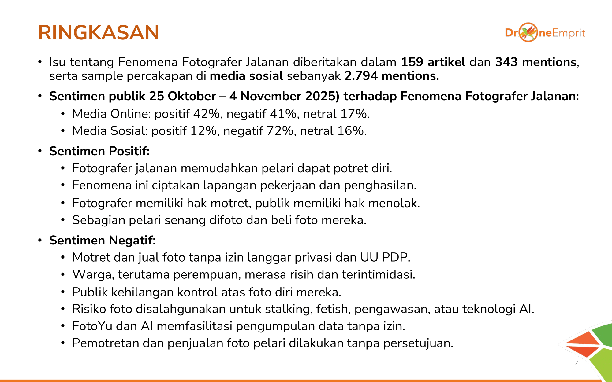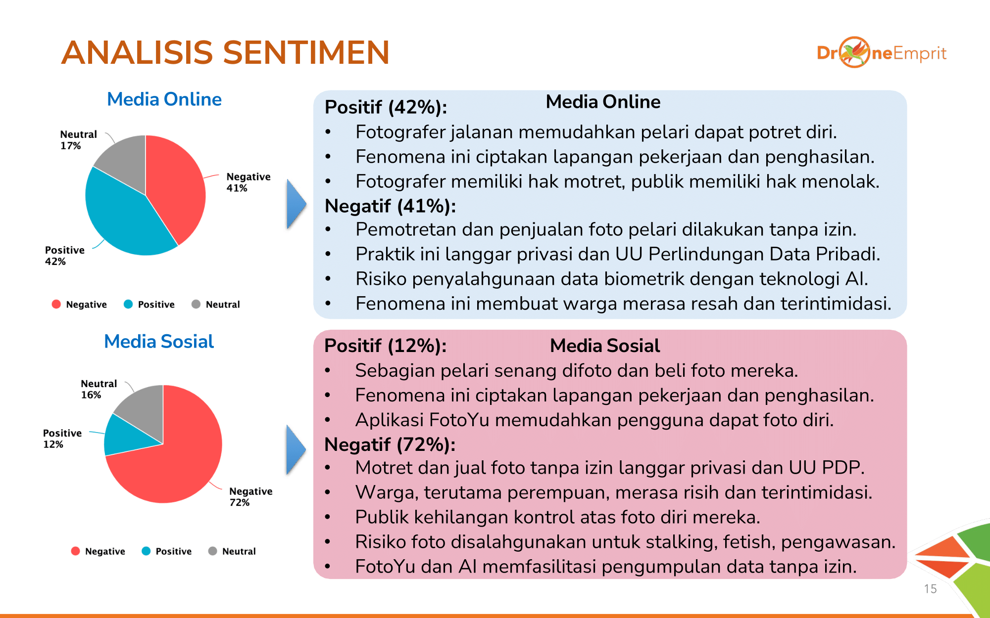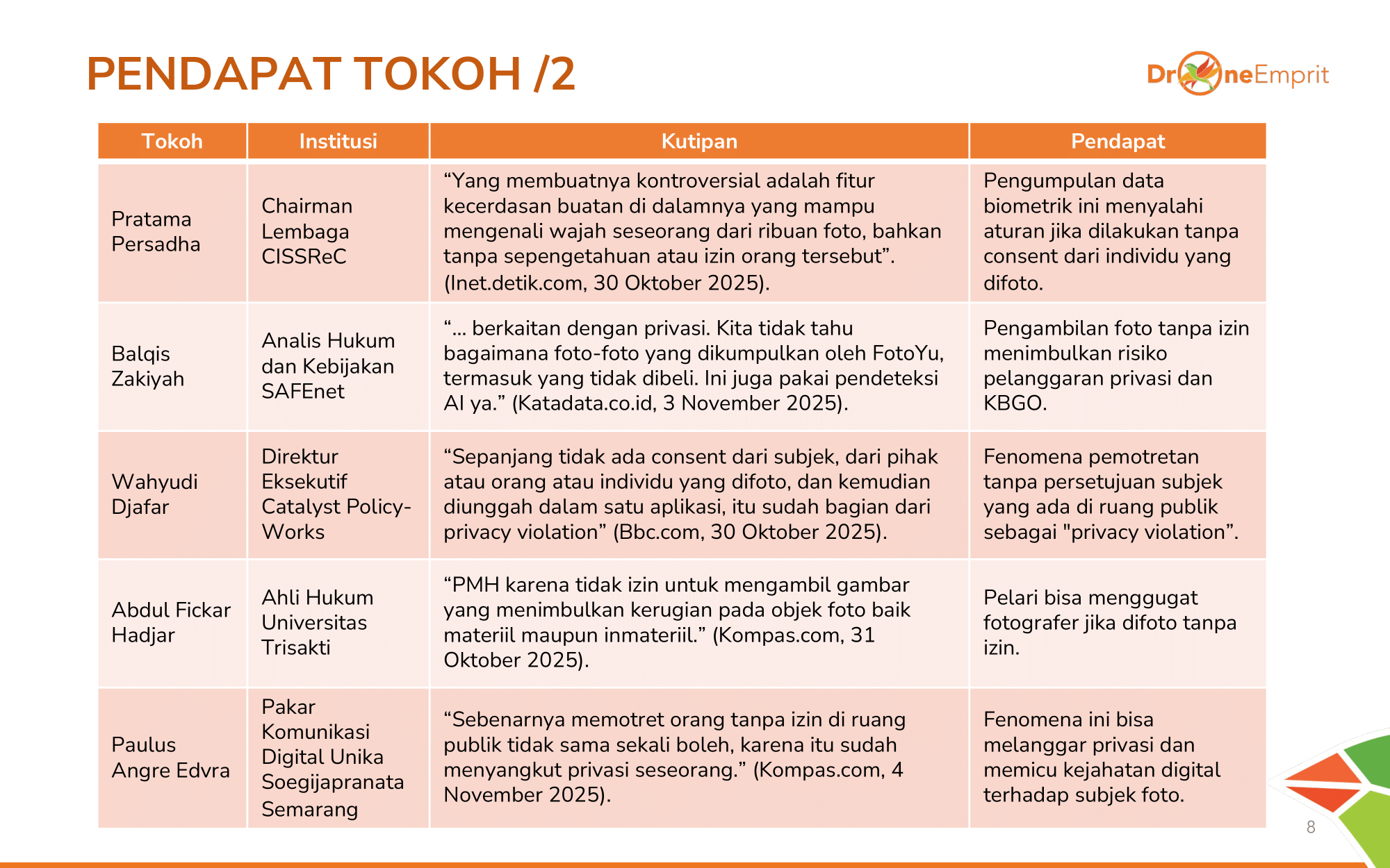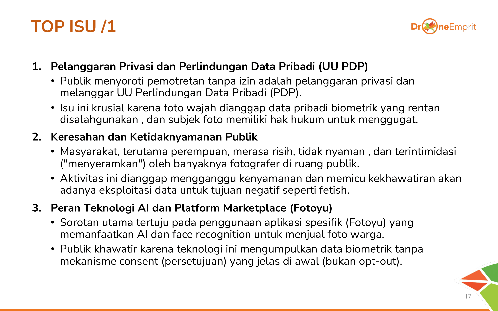 Tiga isu teratas: 1) Pelanggaran Privasi & UU PDP (data biometrik); 2) Keresahan Publik (risih, intimidasi, takut fetish); 3) Fokus pada Platform AI (FotoYu) yang kumpulkan data tanpa consent.