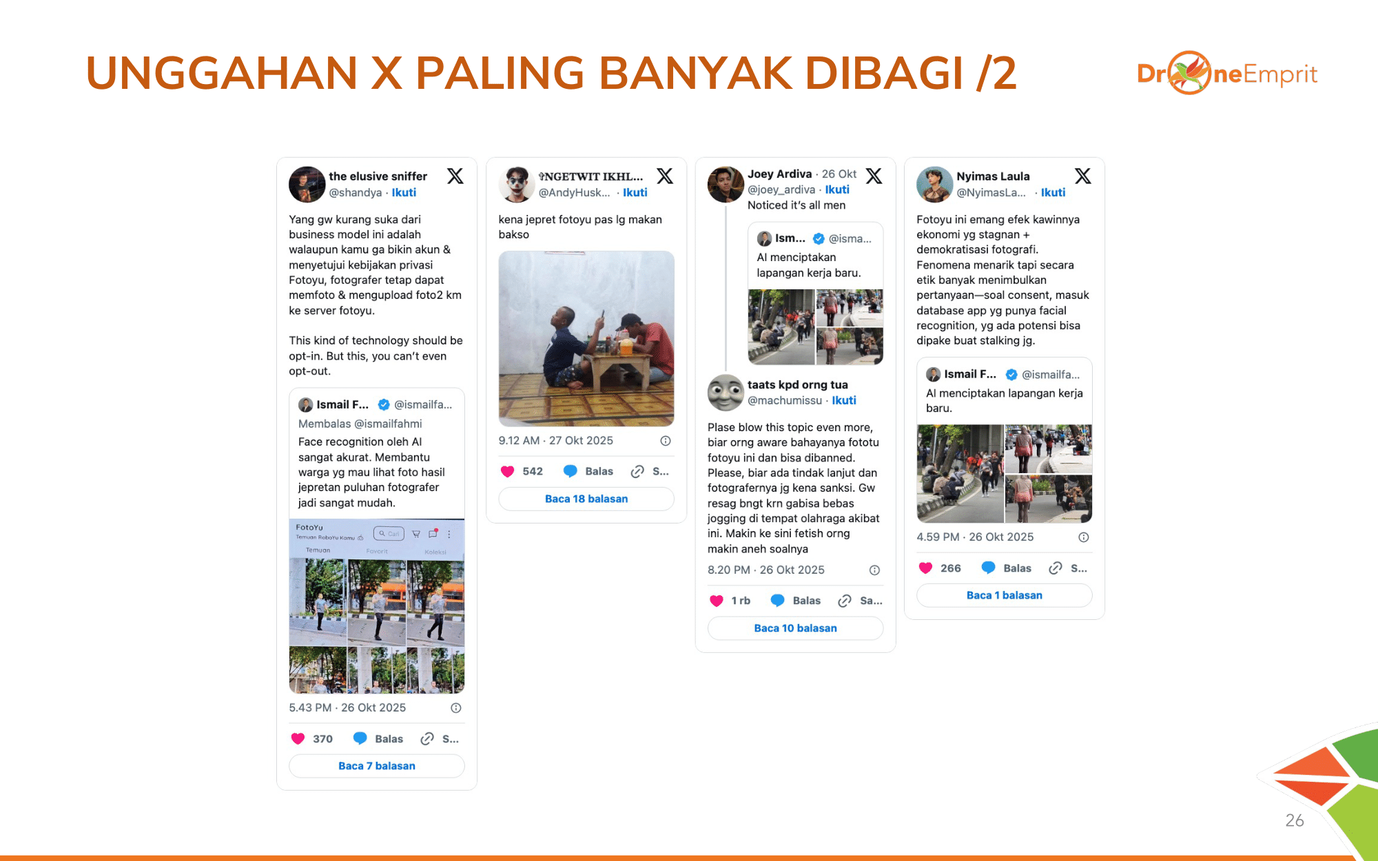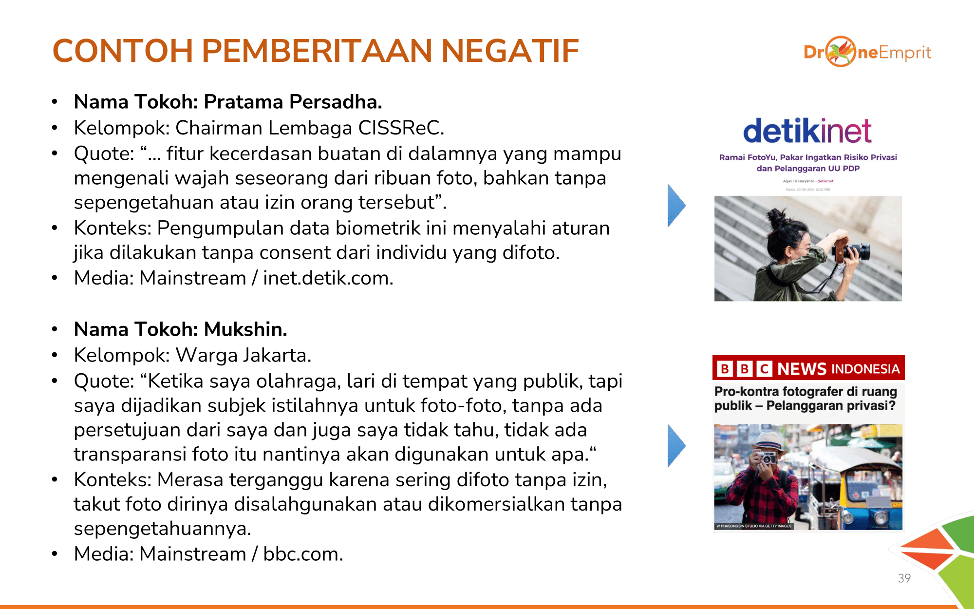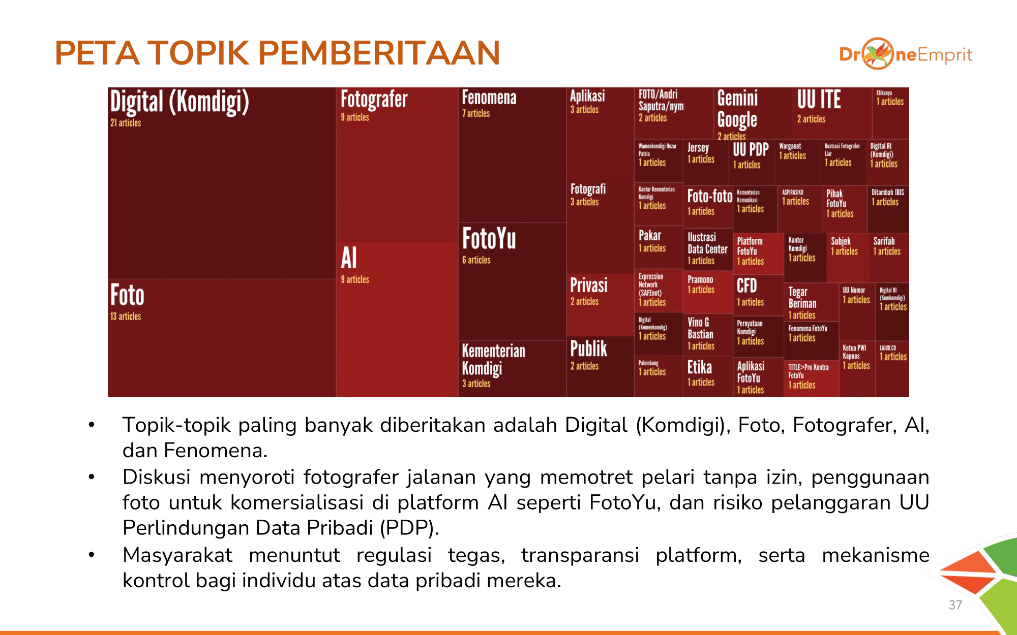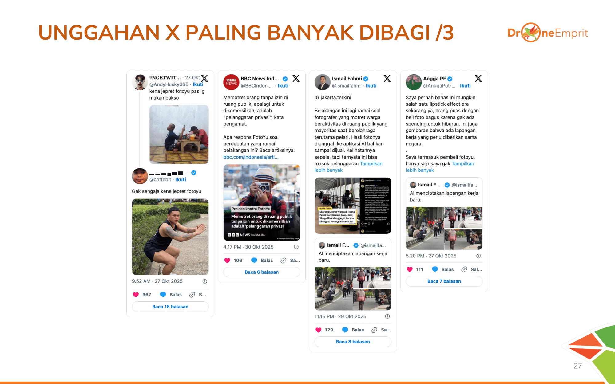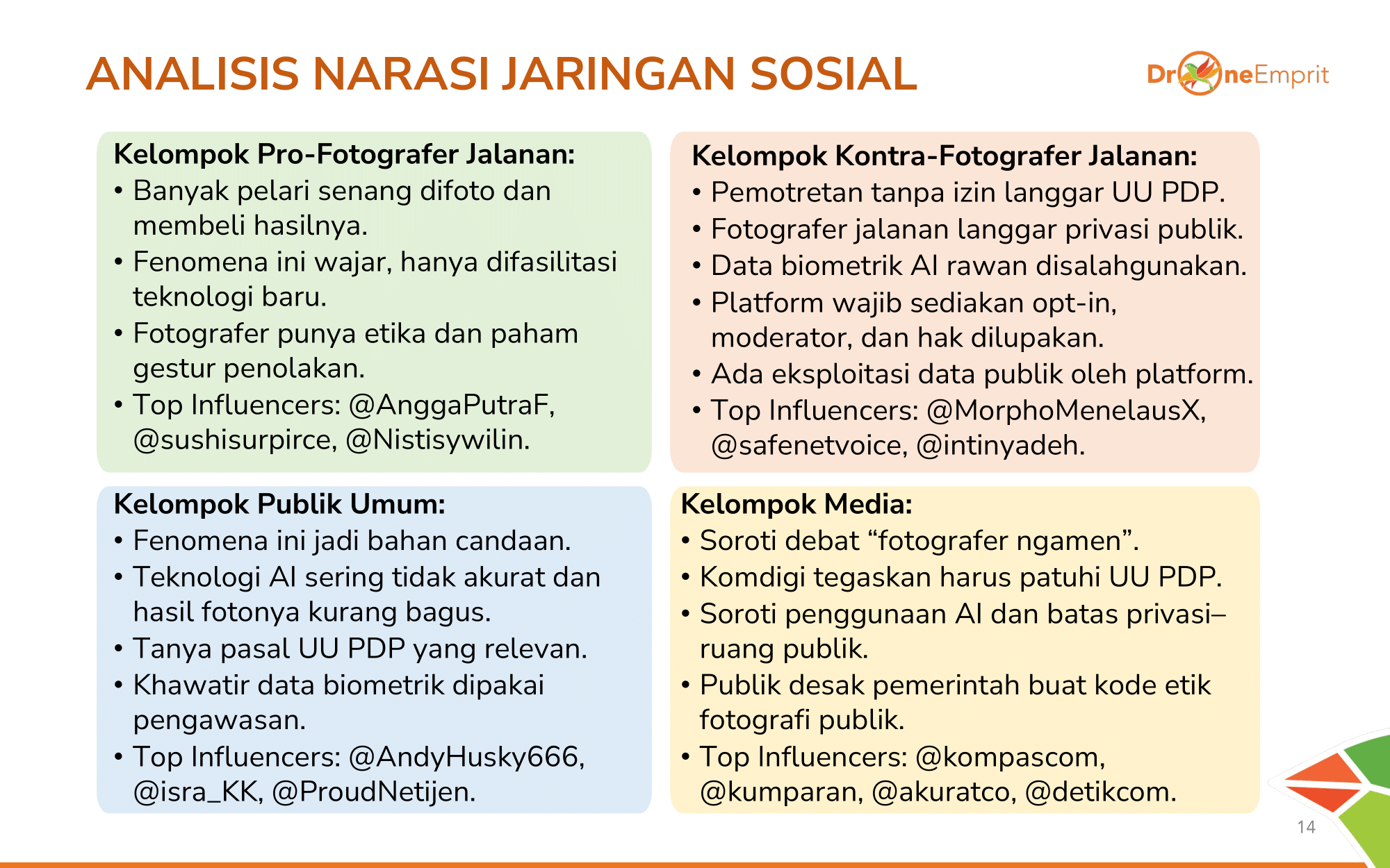 Tiga isu teratas: 1) Pelanggaran Privasi & UU PDP (data biometrik); 2) Keresahan Publik (risih, intimidasi, takut fetish); 3) Fokus pada Platform AI (FotoYu) yang kumpulkan data tanpa consent.