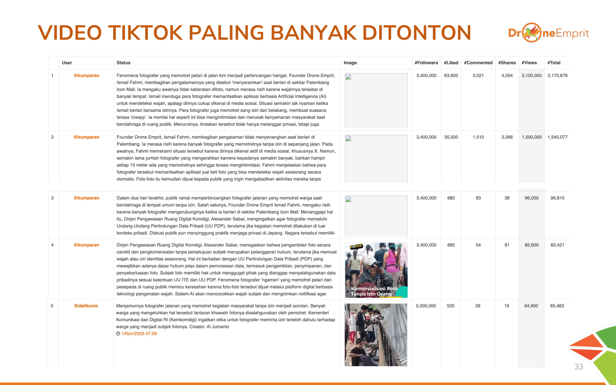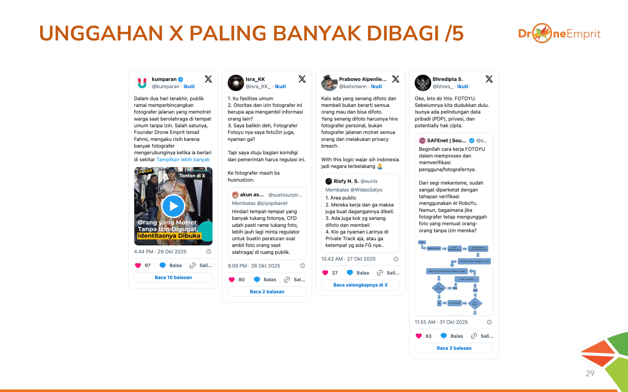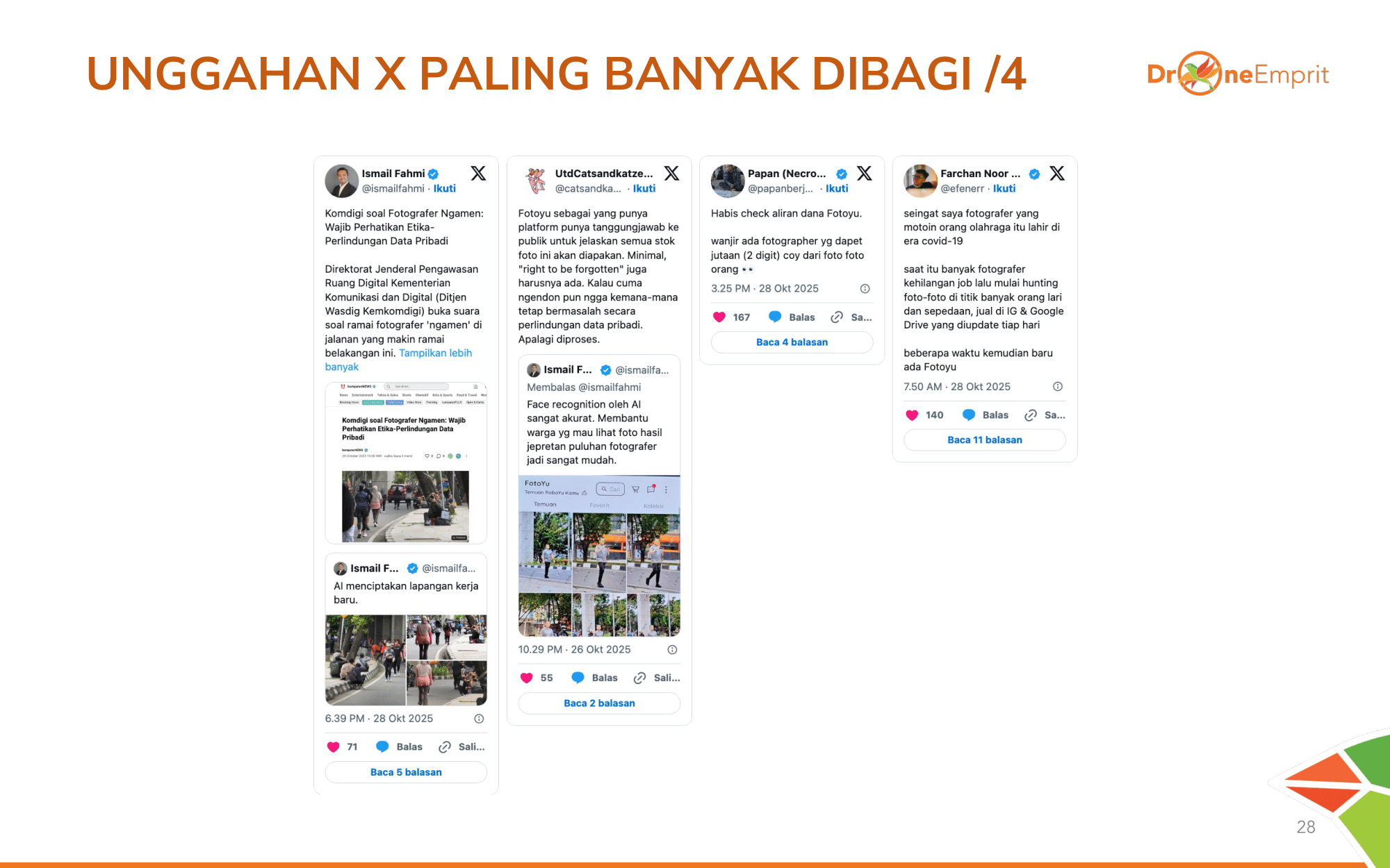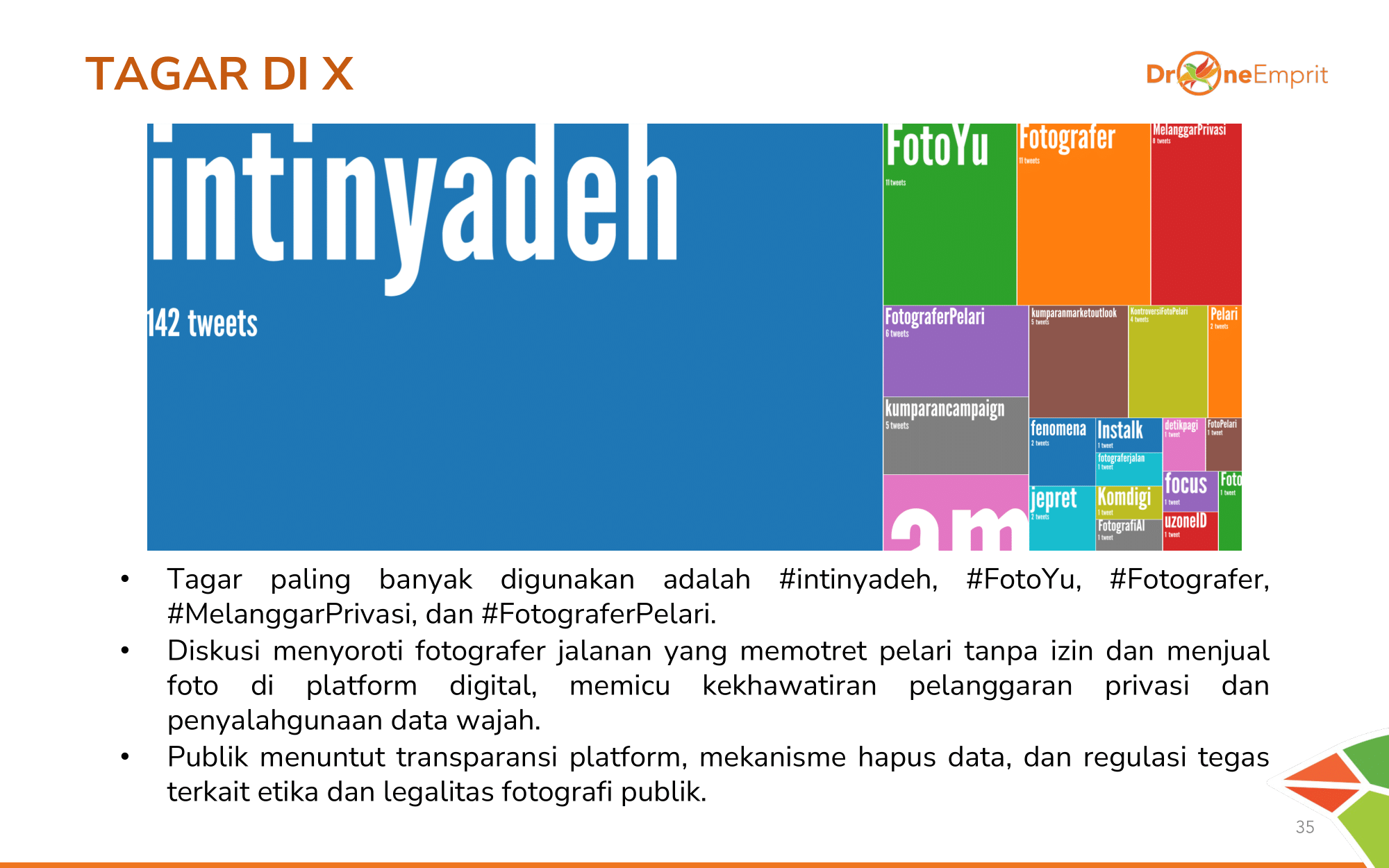 Tiga isu teratas: 1) Pelanggaran Privasi & UU PDP (data biometrik); 2) Keresahan Publik (risih, intimidasi, takut fetish); 3) Fokus pada Platform AI (FotoYu) yang kumpulkan data tanpa consent.