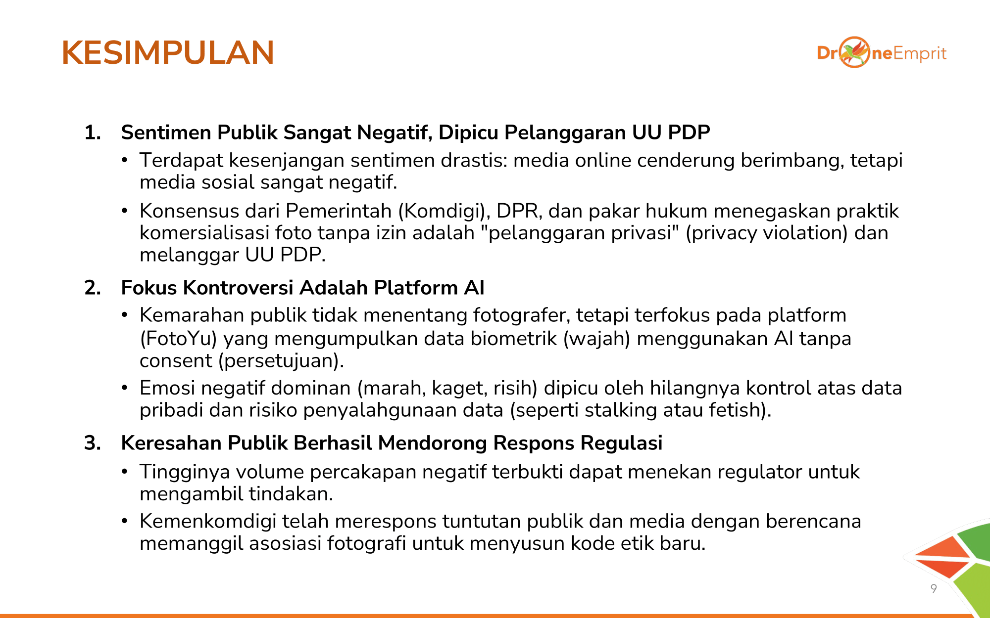 Kesimpulan: 1) Sentimen medsos sangat negatif, dipicu pelanggaran UU PDP. 2) Kemarahan publik terfokus pada platform AI (FotoYu) yang kumpulkan data biometrik. 3) Keresahan publik berhasil mendorong Kemenkomdigi untuk merespons dengan regulasi baru.