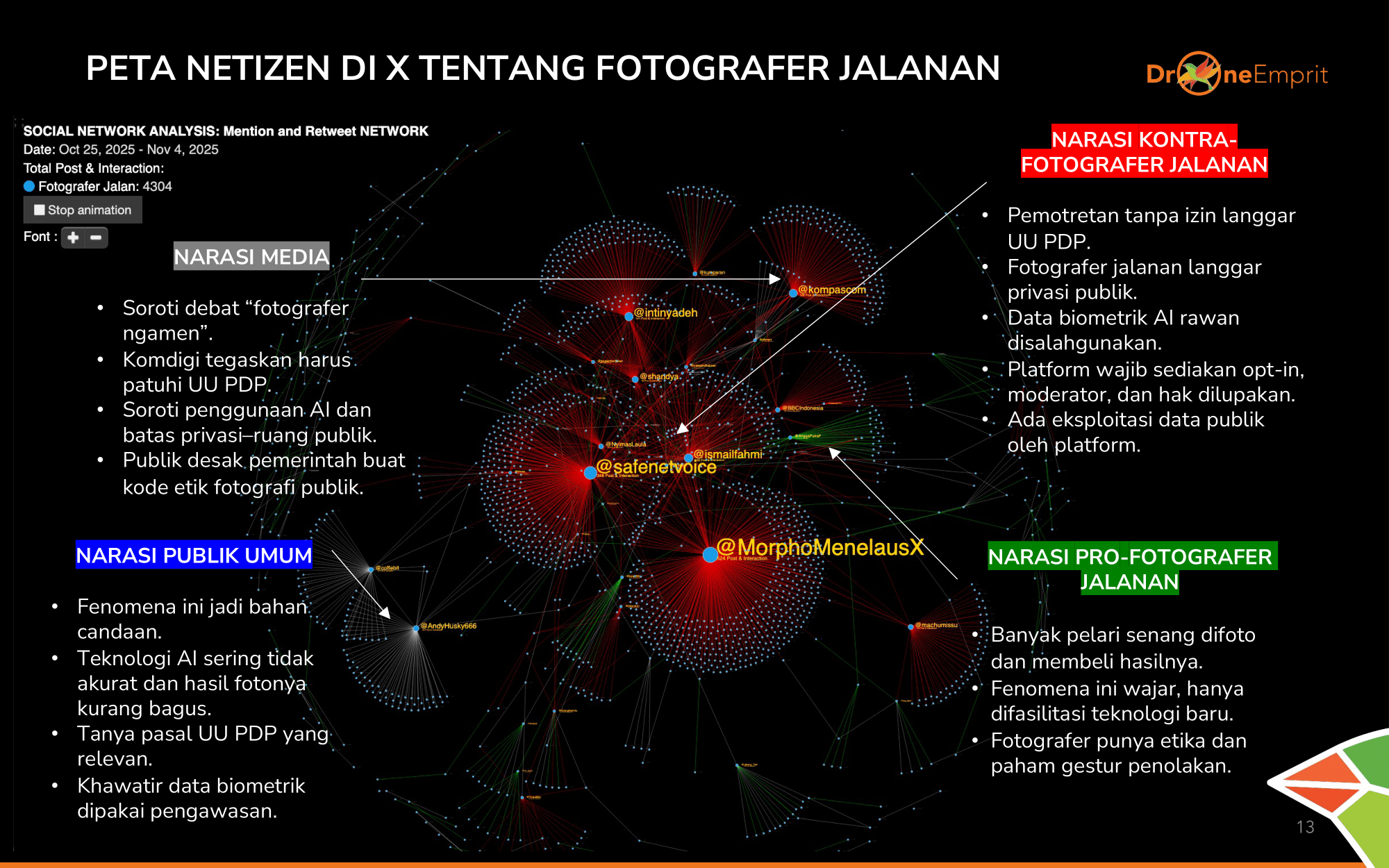 Percakapan di X terbagi 4 klaster: Kontra (UU PDP, privasi) vs. Pro (lapangan kerja, senang difoto). Media soroti debat & desak regulasi.