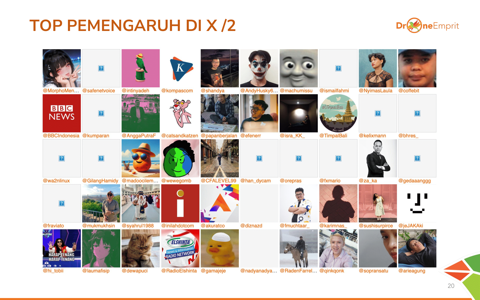 Berikut akun-akun teratas di X. Akun aktivis (@safenetvoice), tokoh publik (@ismailfahmi), dan media (@kompascom, @BBCIndonesia) memegang peranan kunci.