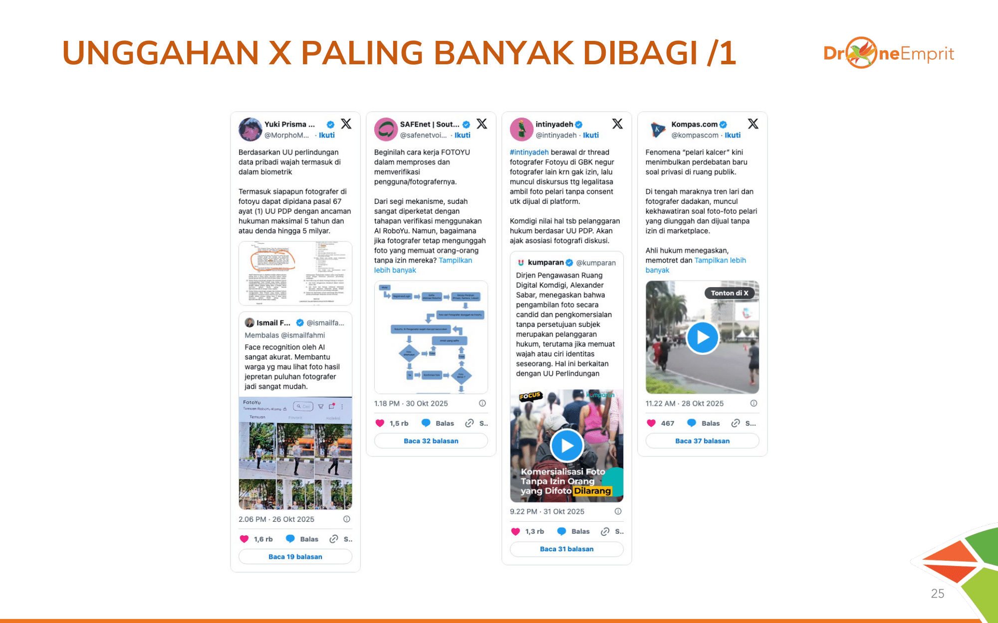 Unggahan X teratas didominasi narasi negatif. @MorphoMenelausX (ancaman pidana UU PDP) & @safenetvoice (kritik AI FotoYu) menjadi yang paling viral & menetapkan kerangka hukum diskusi.