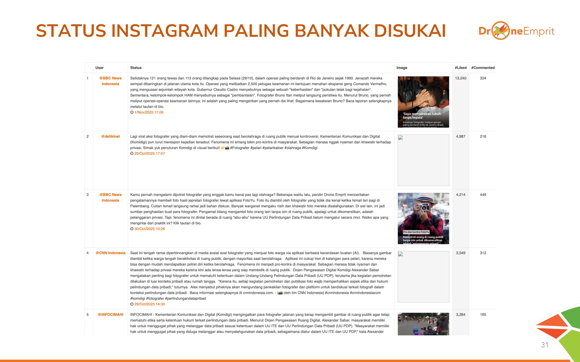 Unggahan IG terpopuler (relevan) dari @detikInet (4,9K likes) & @BBCNewsIndonesia (4,2K likes) membingkai isu ini negatif (keresahan & pelanggaran privasi).