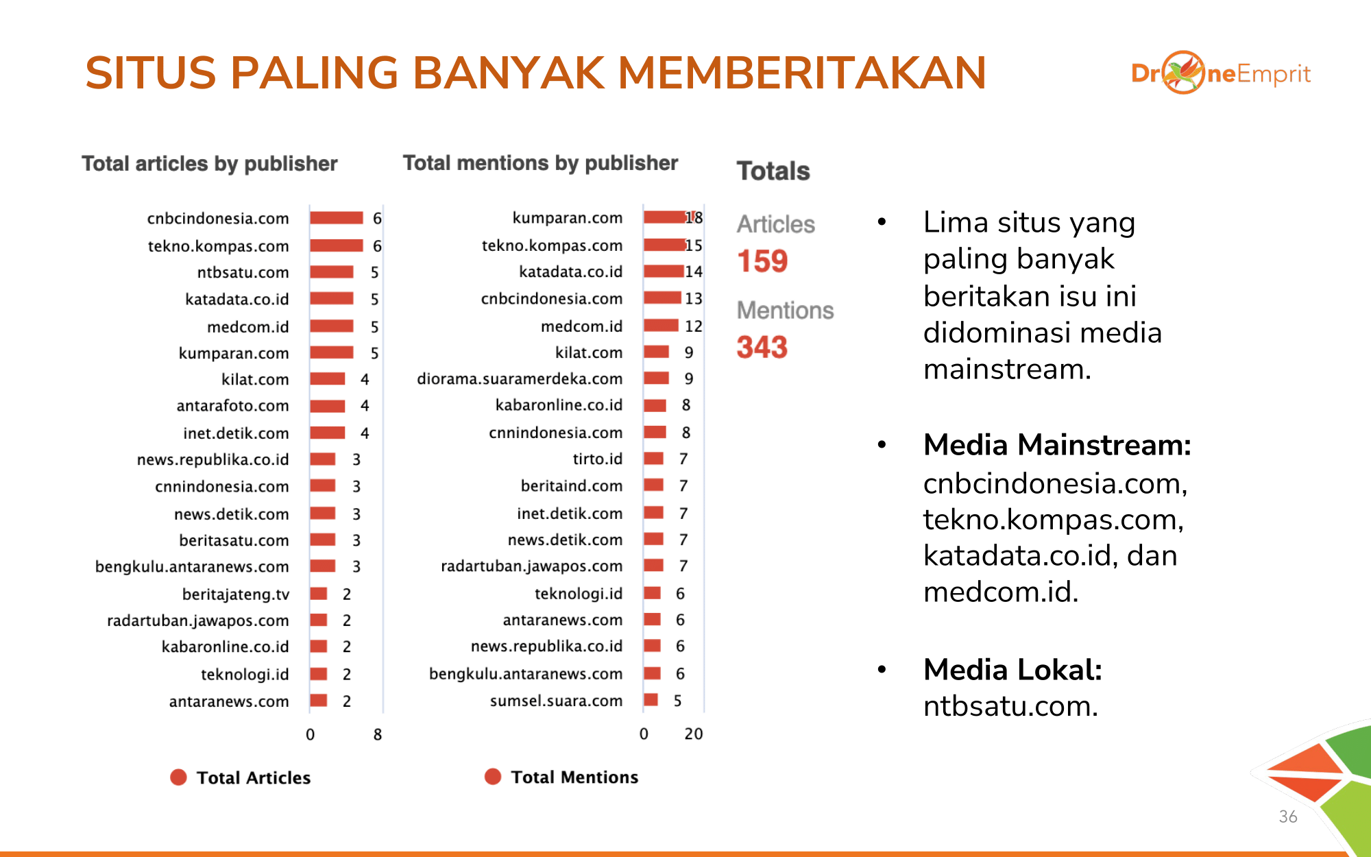 Pemberitaan didominasi media mainstream nasional. cnbcindonesia.com, tekno.kompas.com, katadata.co.id, dan medcom.id adalah 4 media teratas yang paling intensif meliput isu ini.