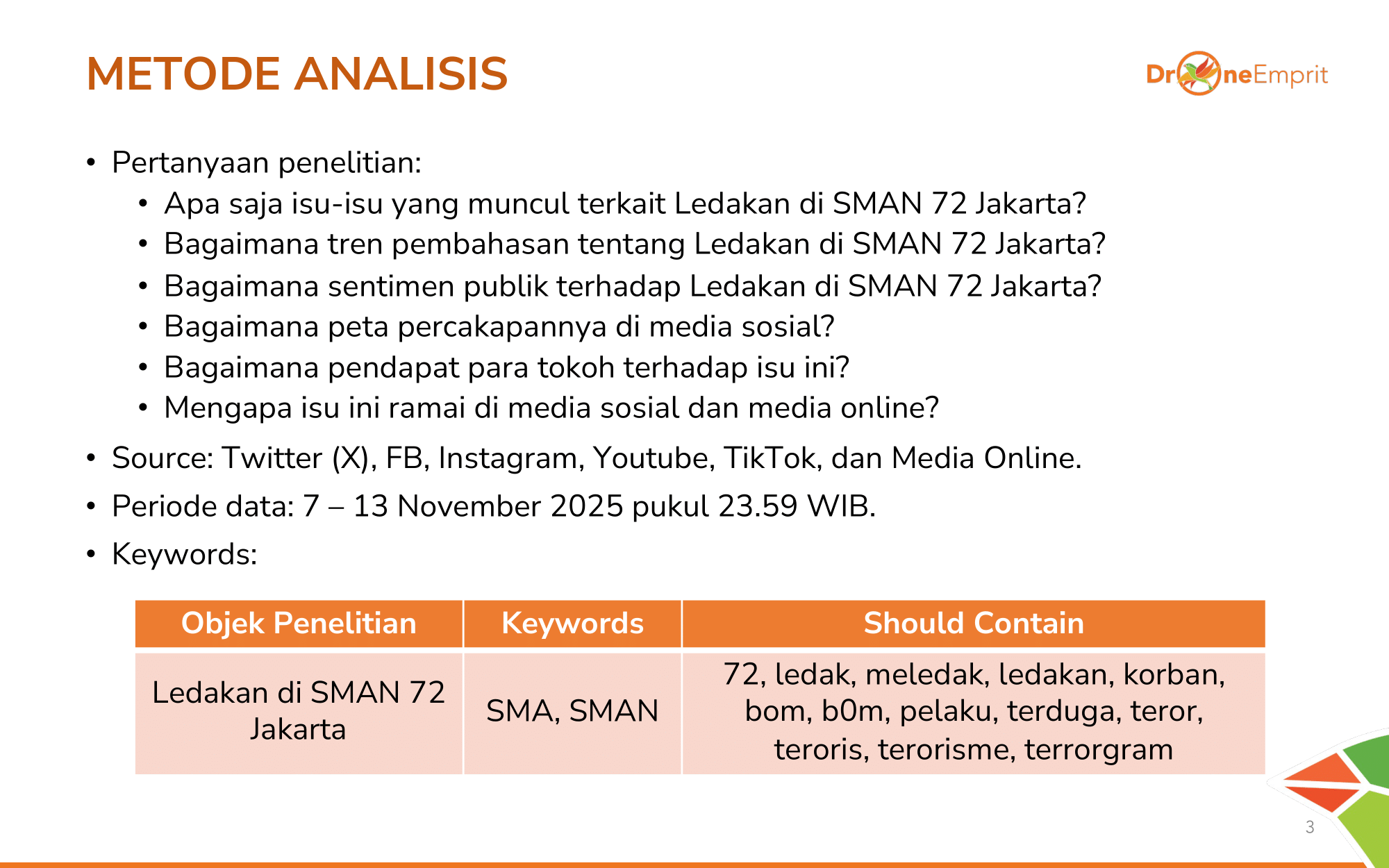 Menggunakan big data dari X, FB, IG, TikTok, YouTube, & Media Online (7-13 Nov), kami melacak kata krusial seperti "ledakan", "bom", hingga "terrorgram" dengan kata kunci utama SMA dan SMAN. Analisis ini menjawab tren, sentimen, hingga peta aktor.