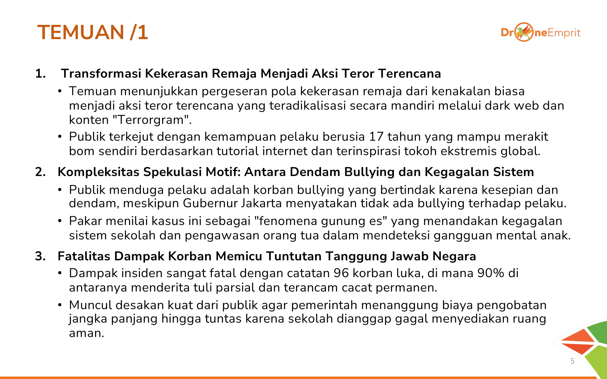Pola teror bergeser: remaja 17 tahun merakit bom via dark web & terinspirasi ekstremis global. Ini dinilai "Terrorgram", bukan sekadar kenakalan. Motifnya diduga irisan antara dendam bullying dan kegagalan deteksi dini sekolah.