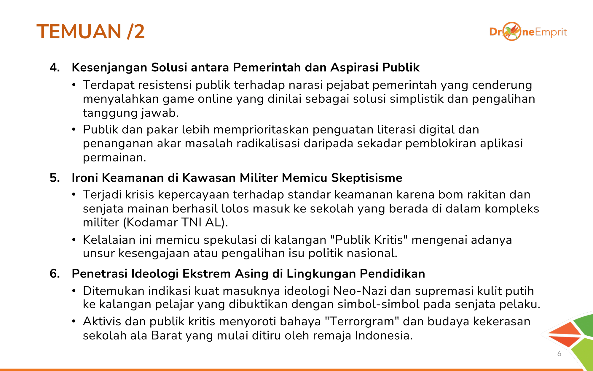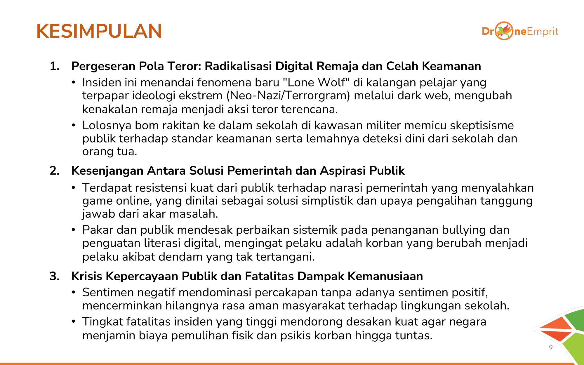 Terjadi pergeseran ke "Lone Wolf" remaja via radikalisasi digital. Ada jurang lebar antara solusi pemerintah (blokir game) dengan tuntutan publik (sistem anti-bullying). Krisis kepercayaan meluas seiring tingginya fatalitas.