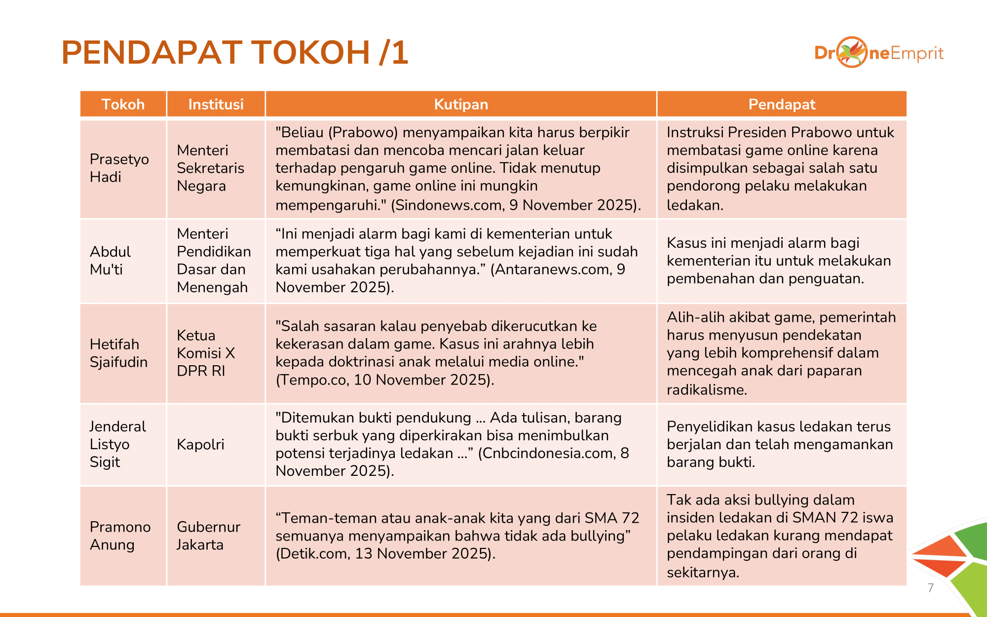 Prabowo (disampaikan melalui Mensesneg) ingin batasi game online, namun Ketua Komisi X DPR menilai itu salah sasaran. Kapolri fokus pada bukti fisik, sedangkan Gubernur Jakarta klaim "tak ada bullying", kontras dengan narasi publik.