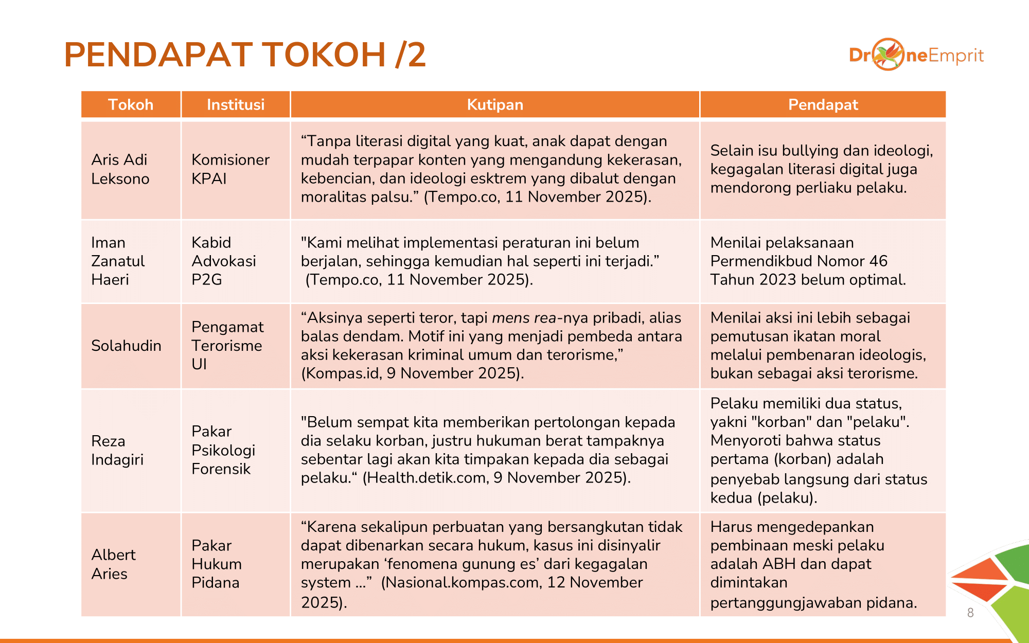 KPAI tekan literasi digital, P2G kritik aturan yang mandul. Pengamat terorisme melihat ini sebagai balas dendam pribadi, sementara psikolog soroti dualitas pelaku yang juga korban. Kasus ini adalah fenomena gunung es.