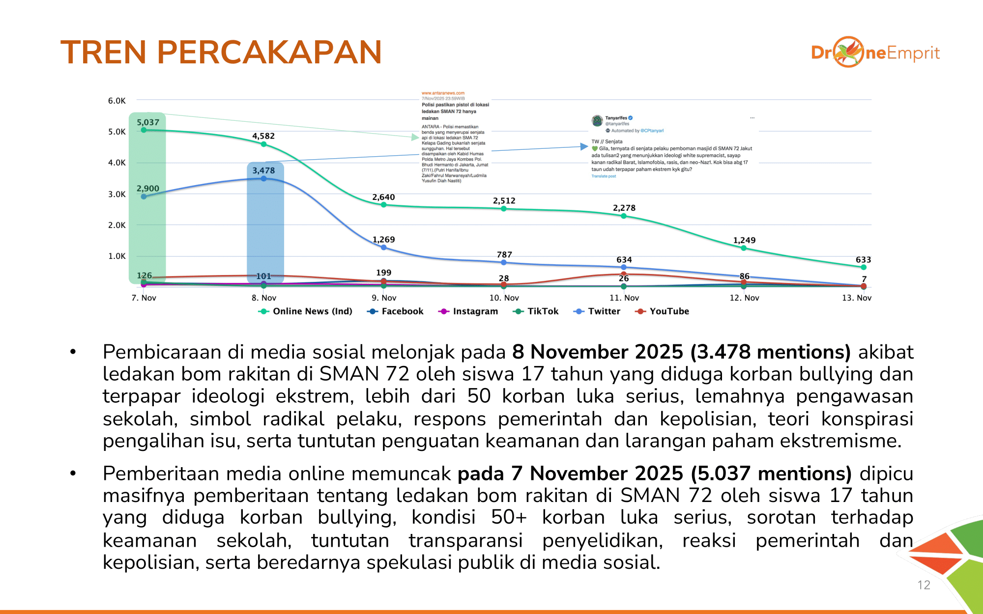 Media online memuncak di hari kejadian (7/11), namun medsos meledak sehari setelahnya (8/11). Pemicunya: fakta pelaku 17 tahun, kondisi 50+ korban, hingga teori konspirasi pengalihan isu.