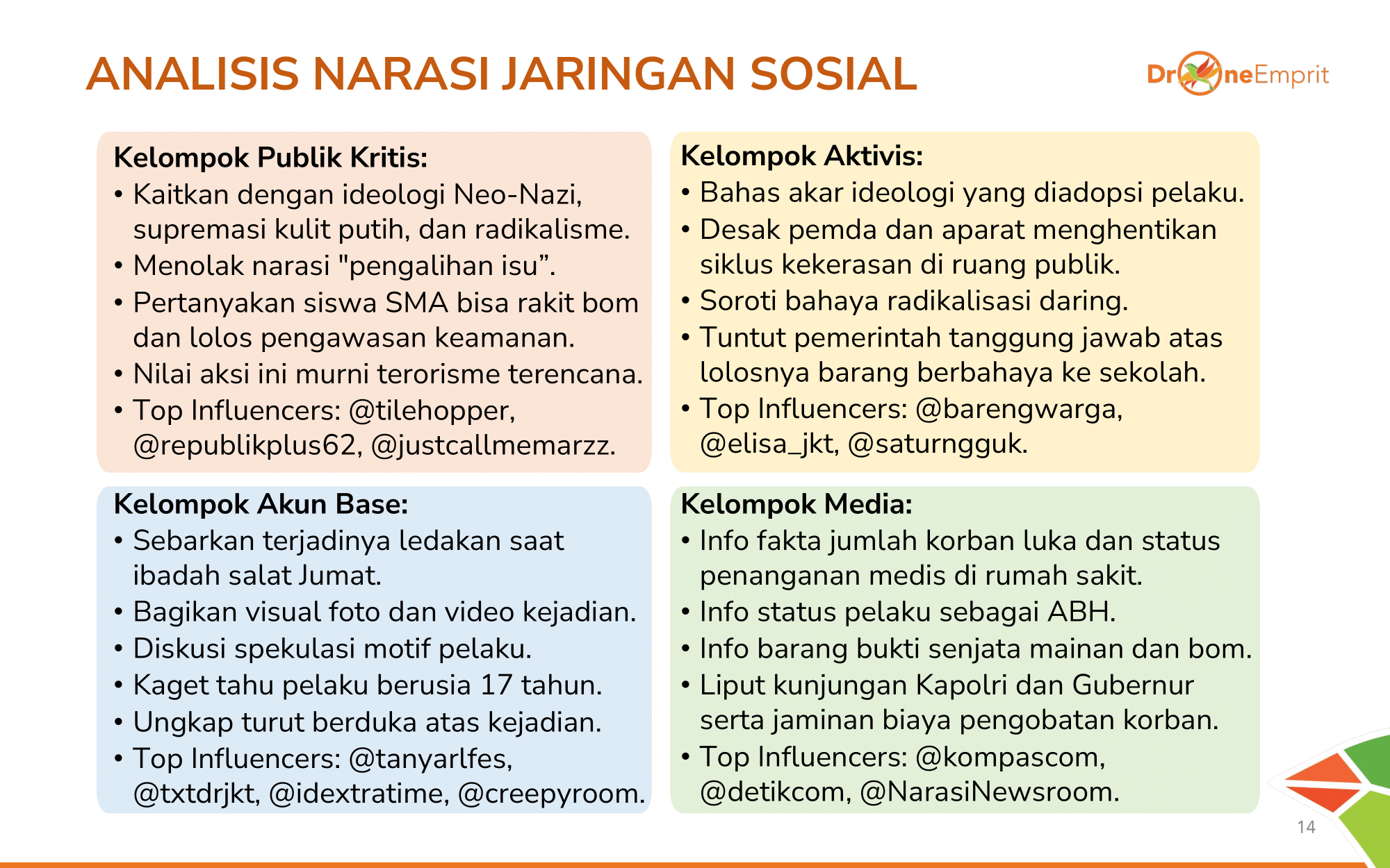 Terbagi 4 klaster: Publik Kritis fokus pada ideologi Neo-Nazi & tolak pengalihan isu. Aktivis bahas akar kekerasan. Akun Base sebar visual & rasa kaget. Media fokus pada fakta medis & hukum.