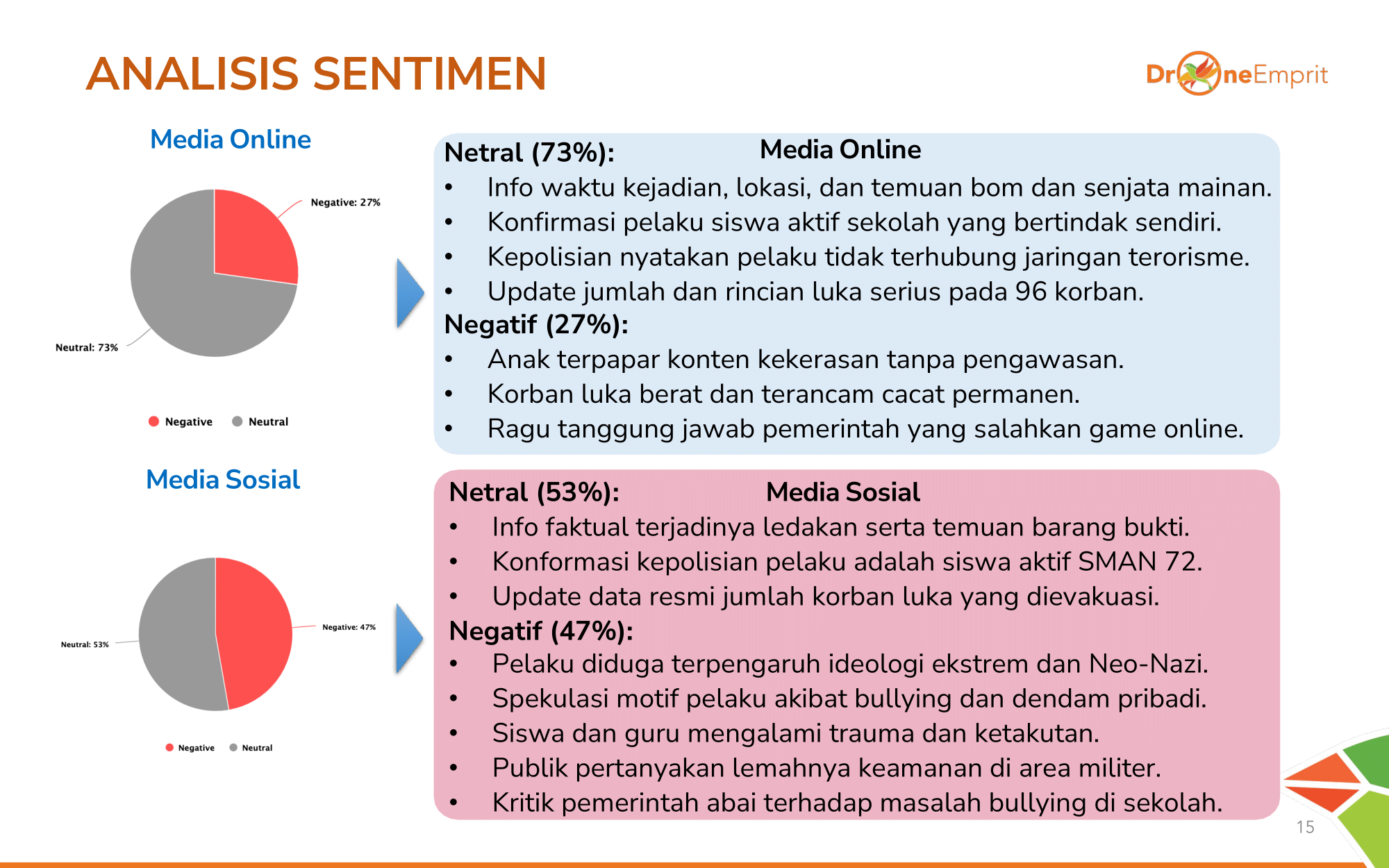Media cenderung netral (73%) melaporkan fakta. Medsos jauh lebih emosional dengan sentimen negatif mencapai 47%, didorong spekulasi motif, ketakutan, & kritik pemerintah. Nihil sentimen positif di semua kanal.