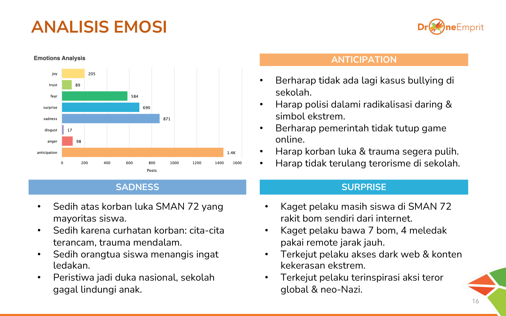 Surprise tinggi karena kaget siswa 17 tahun bisa merakit bom. Sadness juga tinggi melihat kondisi korban. Anticipation mendominasi dengan harapan polisi usut tuntas radikalisasi daring & bullying.