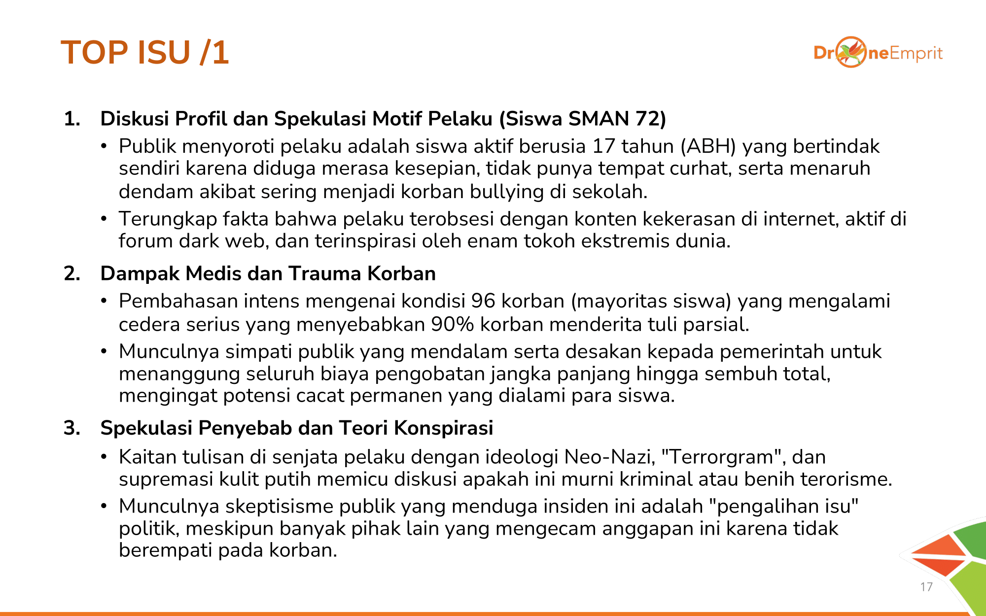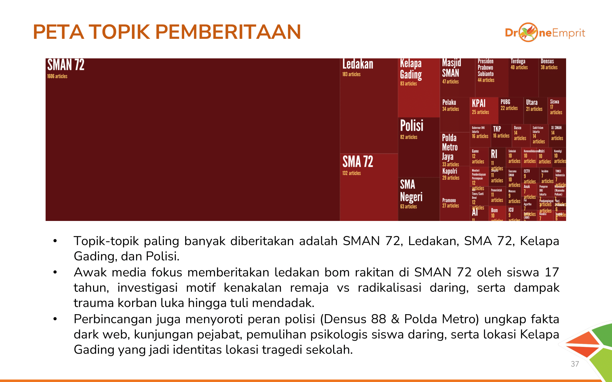 Pemberitaan terpusat seputar "SMAN 72" dan "Ledakan". Fokus media adalah investigasi Densus 88, motif bom rakitan, dan dampak trauma korban. Sangat berbasis fakta investigasi.