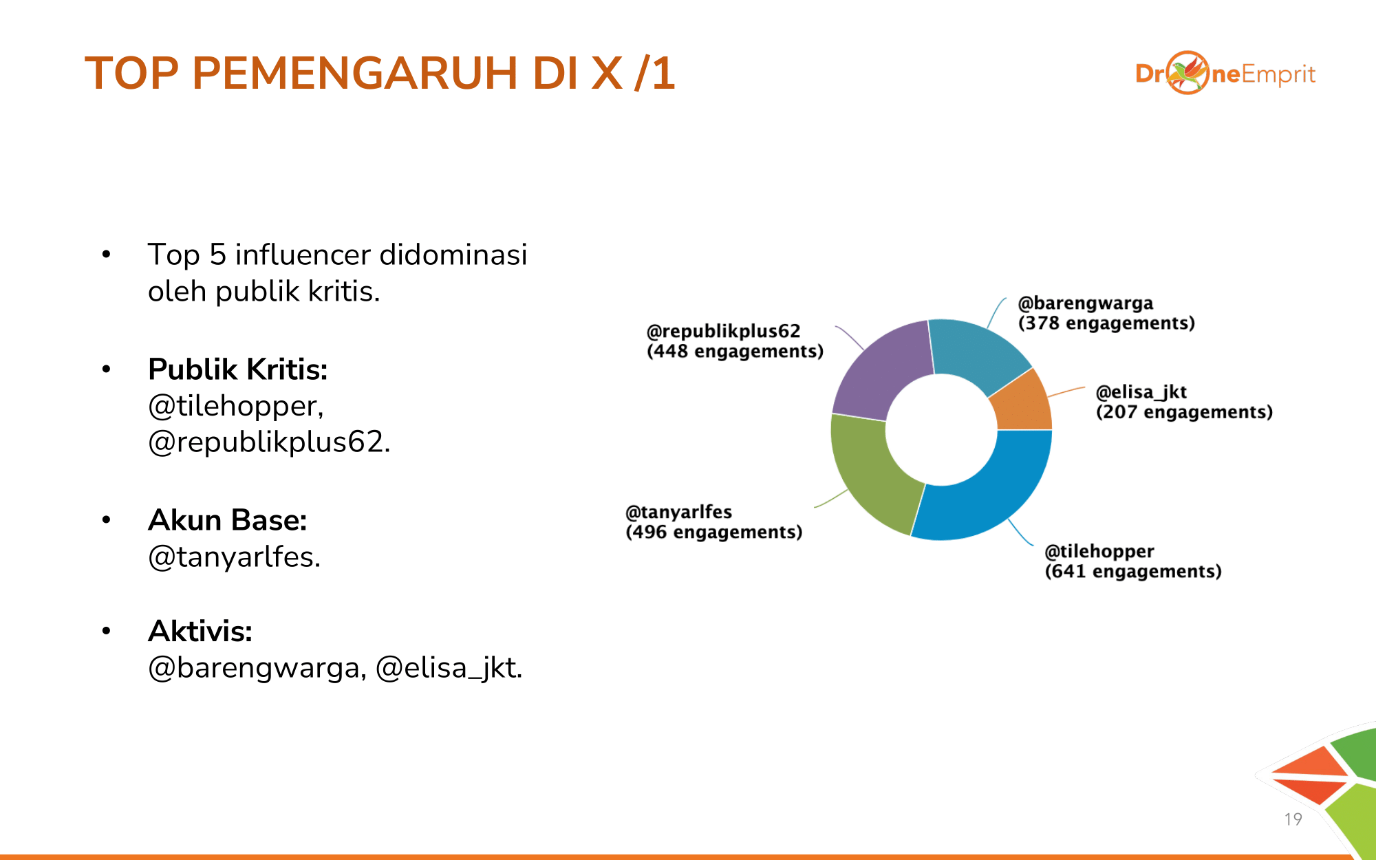 Peta influencer dikuasai Publik Kritis (@tilehopper) yang mengungkap sisi ideologis, dan Akun Base (@tanyarlfes) sebagai wadah diskusi massa. Aktivis seperti @barengwarga vokal mengawal isu ini.