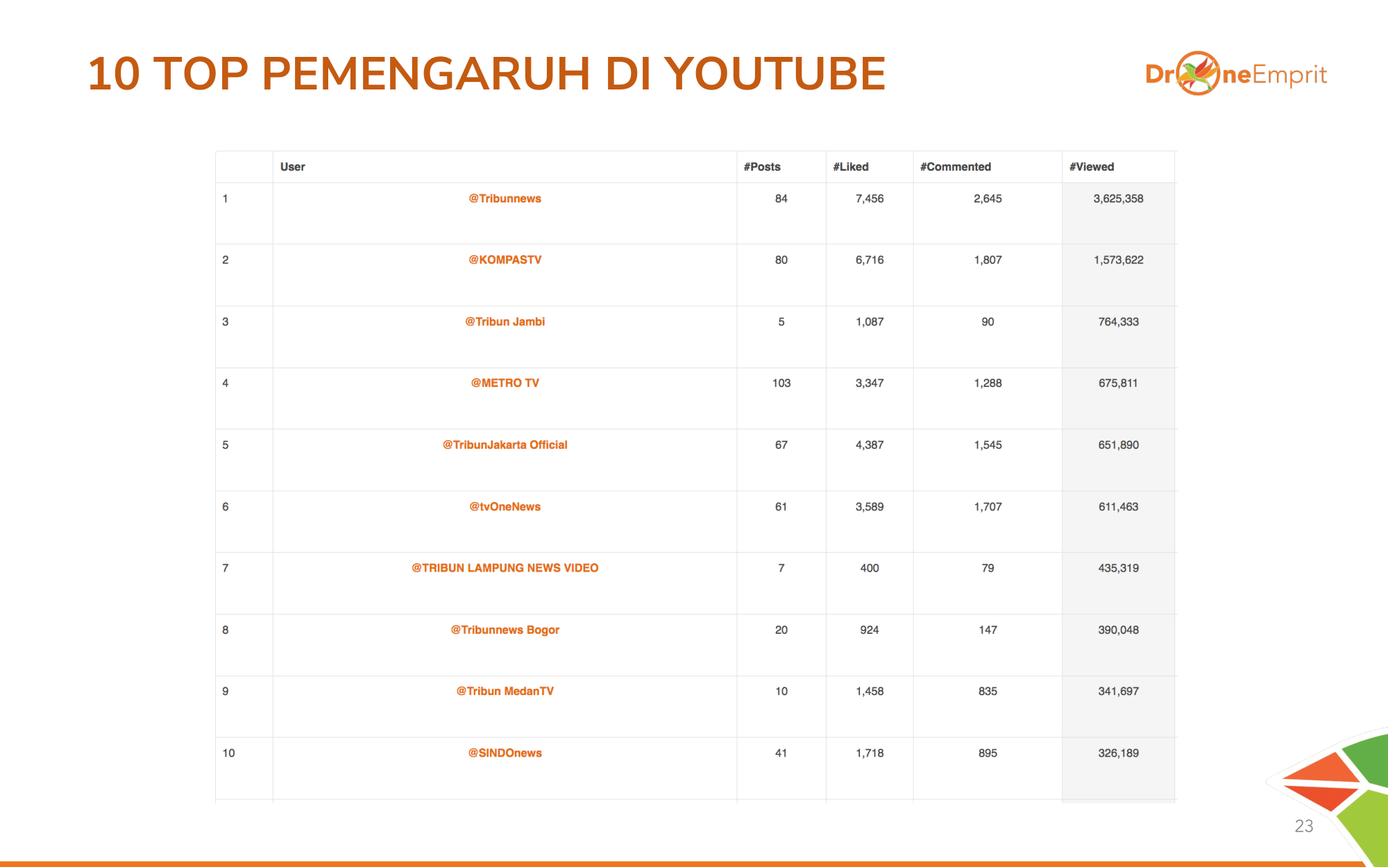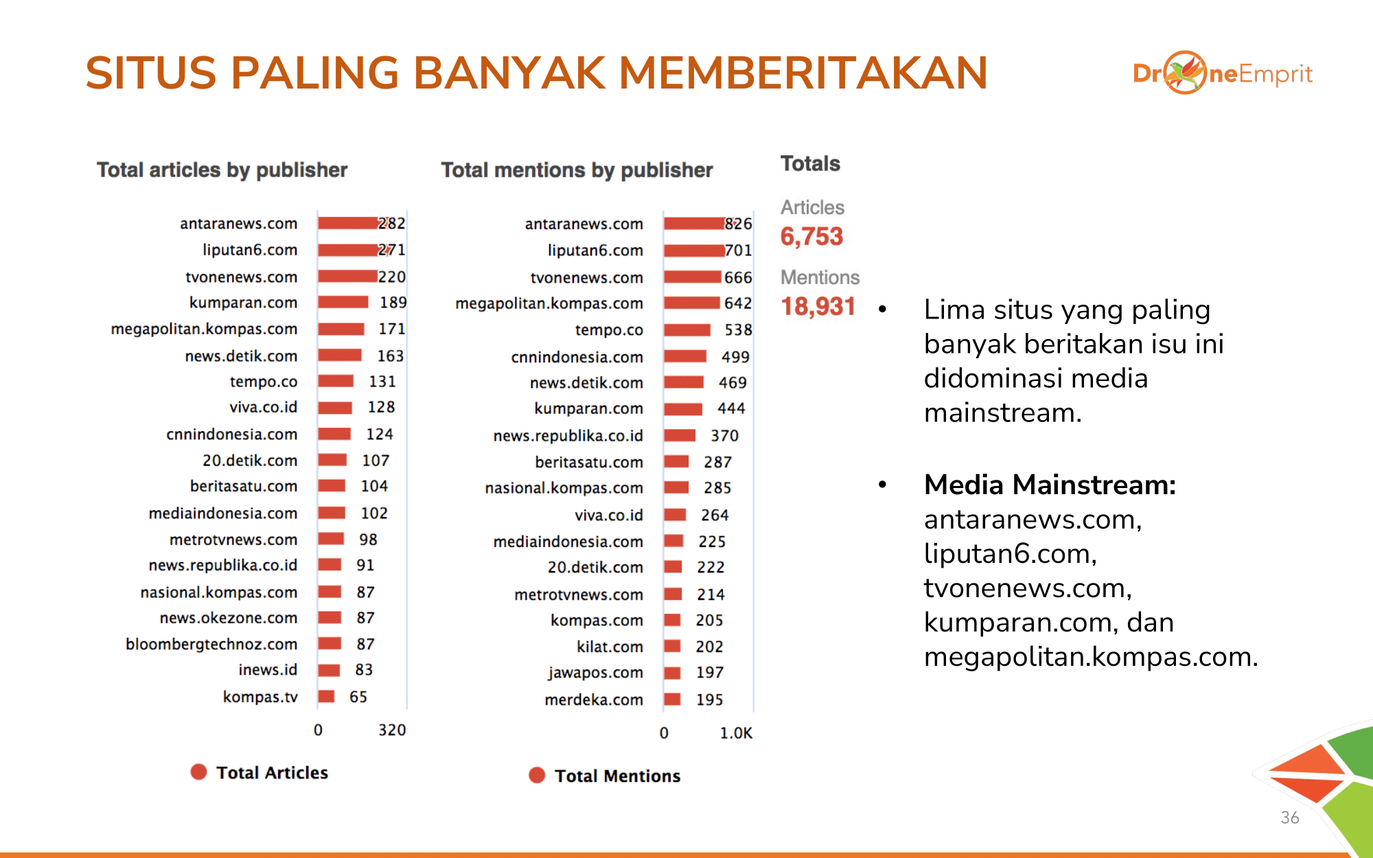Media mainstream seperti Antara, Liputan6, dan TVOne mendominasi volume berita. Mereka fokus pada update resmi kepolisian dan pemerintah, berusaha menjadi penyeimbang informasi di medsos.