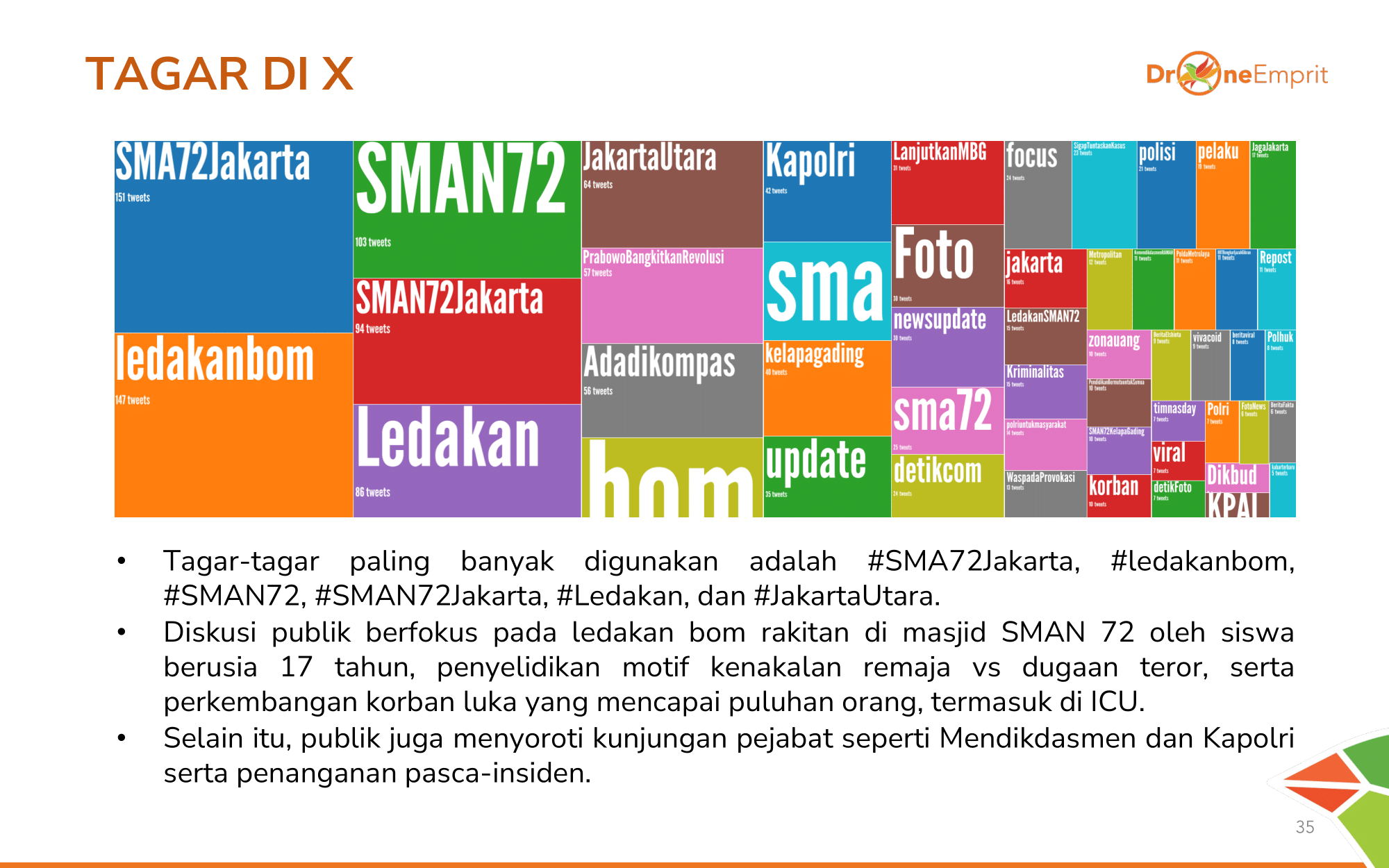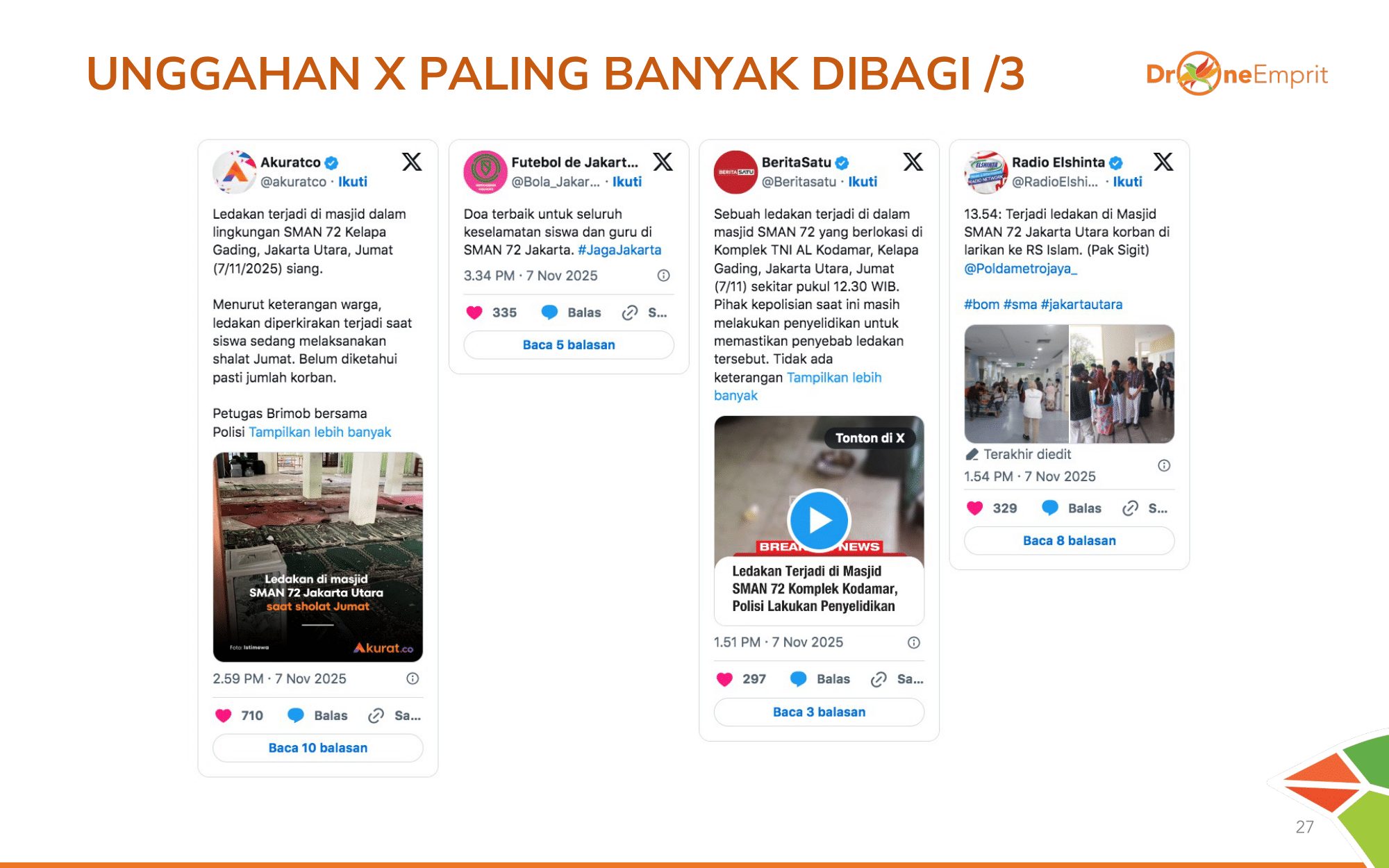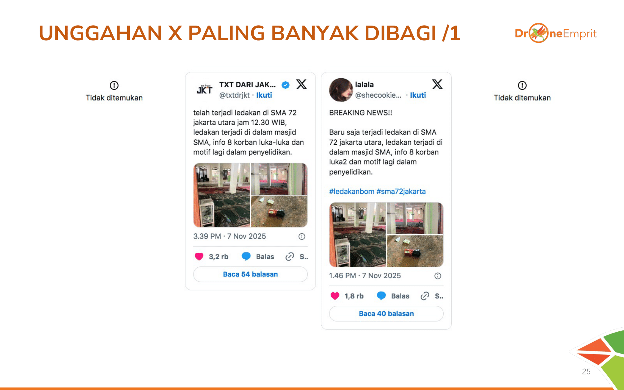 #SMA72Jakarta dan #ledakanbom menjadi payung informasi utama. Tagar ini menyatukan laporan pandangan mata, doa untuk 96 korban, hingga kritik pedas terhadap standar keamanan sekolah.