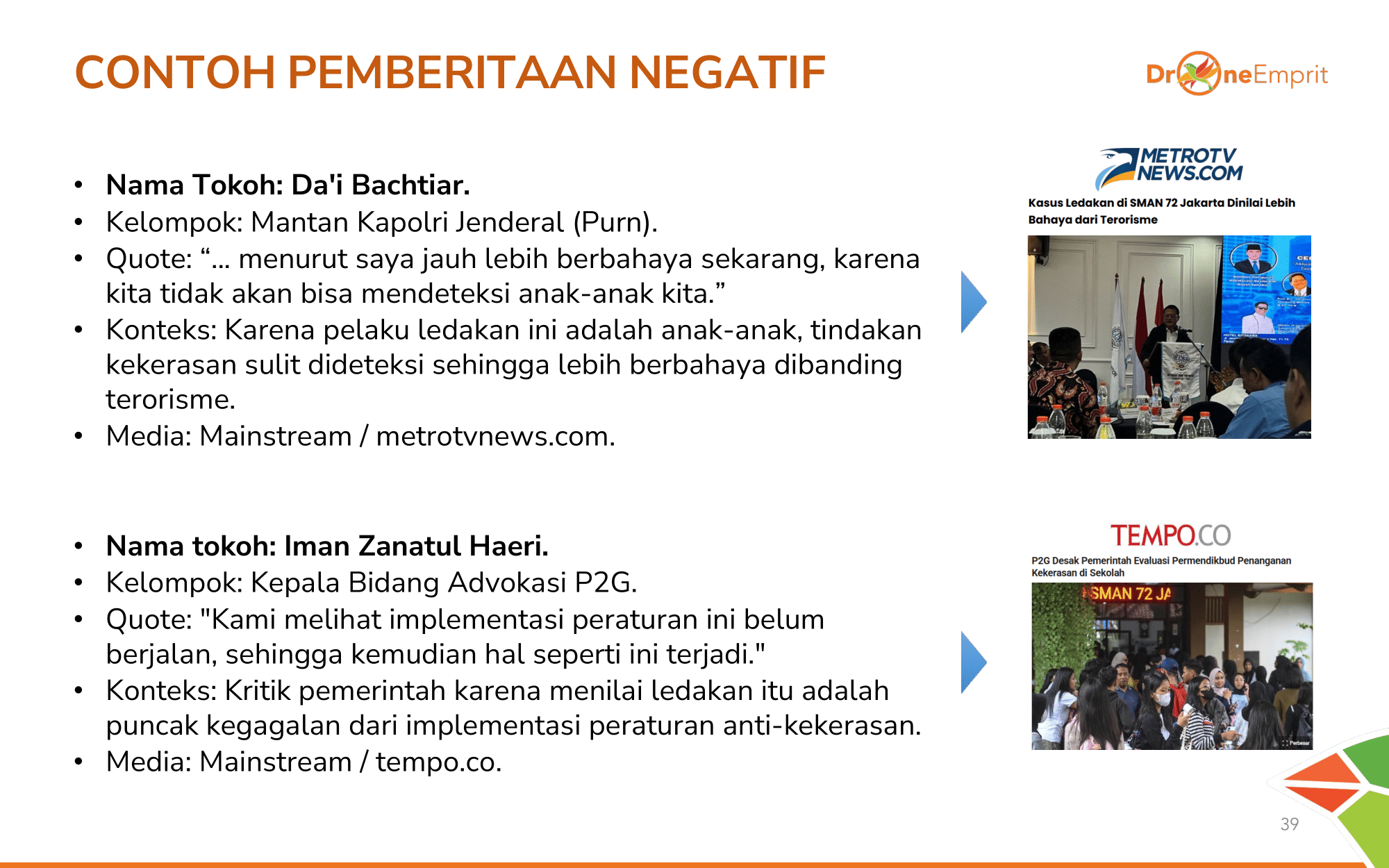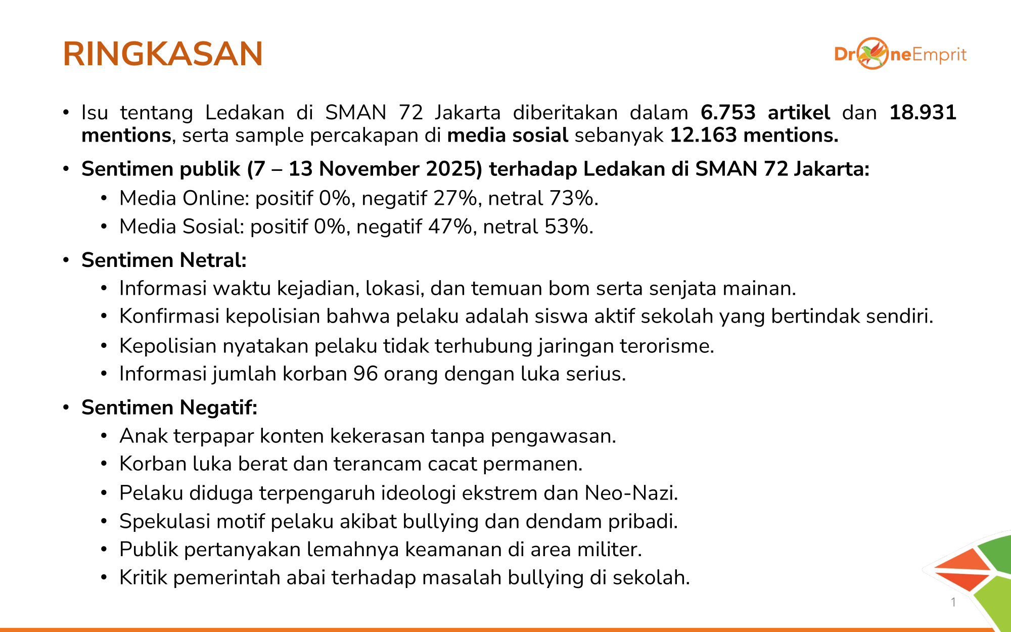 Dengan 31k+ mentions, sentimen negatif di medsos (47%) jauh lebih tinggi dari media online (27%). Publik marah soal keamanan sekolah, trauma korban, hingga dugaan ideologi ekstrem. Tak ada sentimen positif sama sekali.