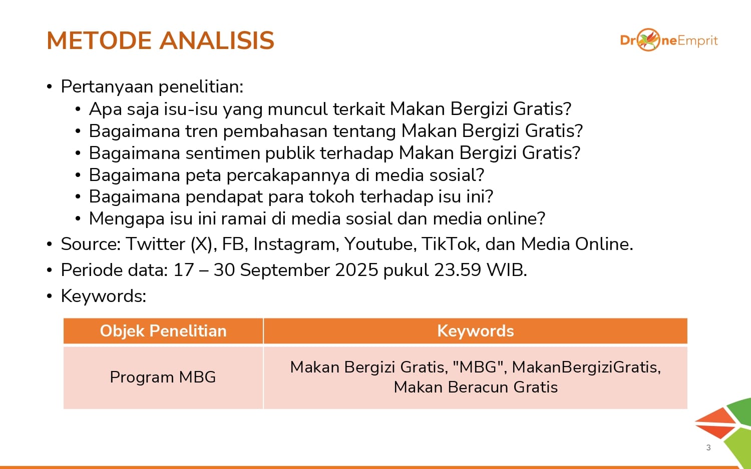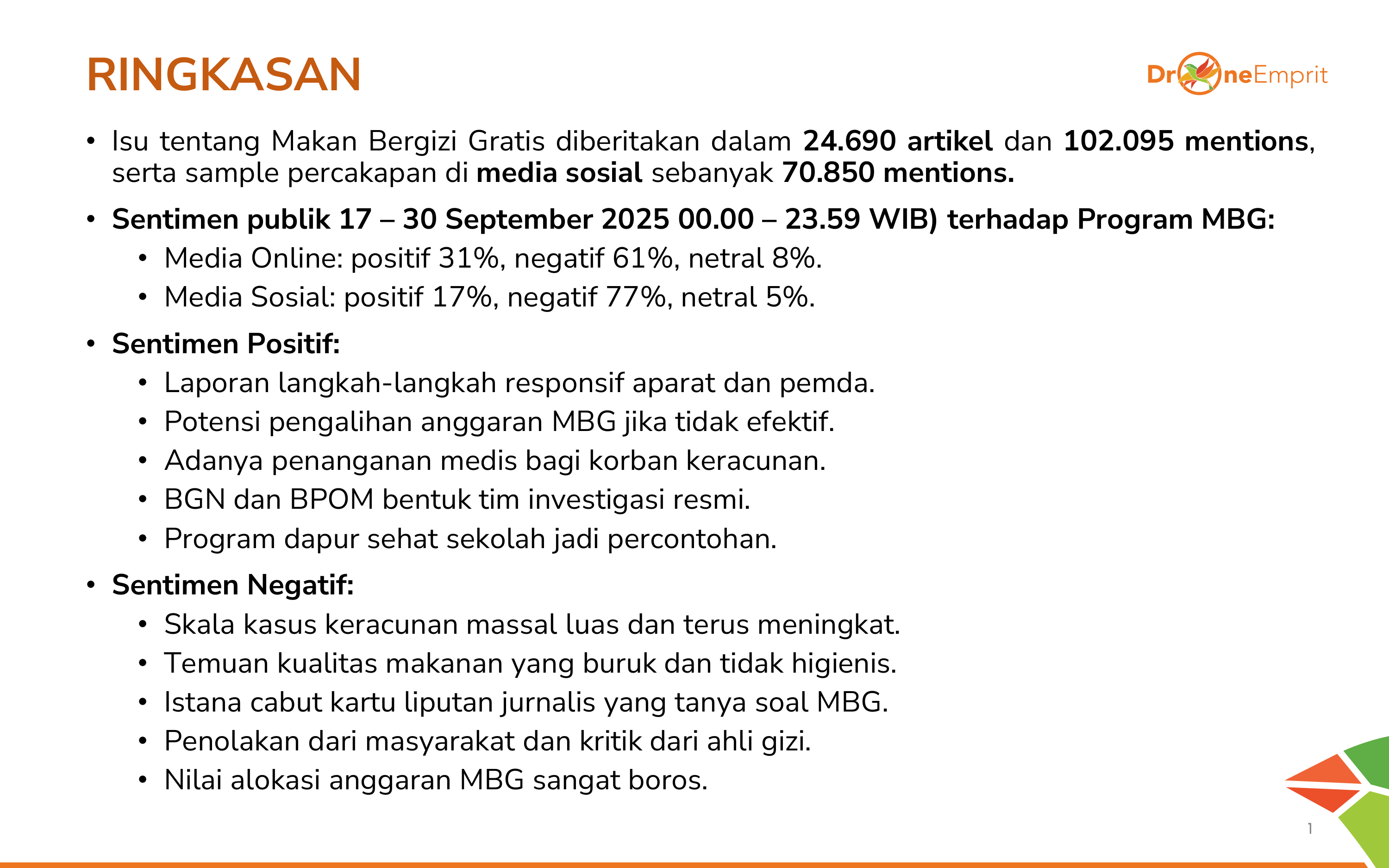 Untuk memahami polemik MBG, kami memantau jutaan percakapan di media sosial & online news, 17-30 Sep 2025. Dengan kata kunci seperti "Makan Bergizi Gratis" hingga "Makan Beracun Gratis", kami memetakan sentimen publik.