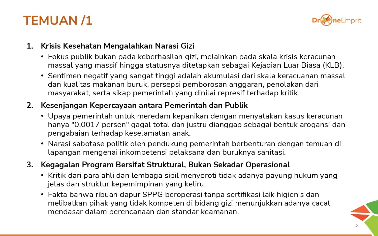 Temuan awal menunjukkan 3 masalah fundamental: krisis kesehatan yang menutupi narasi gizi, runtuhnya kepercayaan publik akibat respons pemerintah yang dianggap arogan, dan kegagalan struktural dari hulu ke hilir. Namun, masalahnya ternyata lebih dalam.