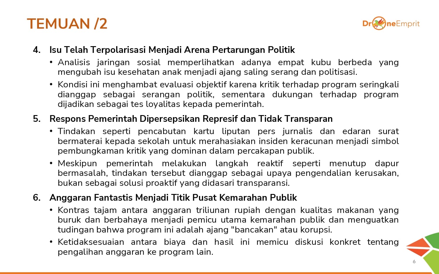 Isu ini telah terpolarisasi menjadi arena politik, menghambat evaluasi objektif. Ditambah respons pemerintah yang dianggap represif & anggaran fantastis yang memicu curiga, program MBG kini berada di titik kritis.