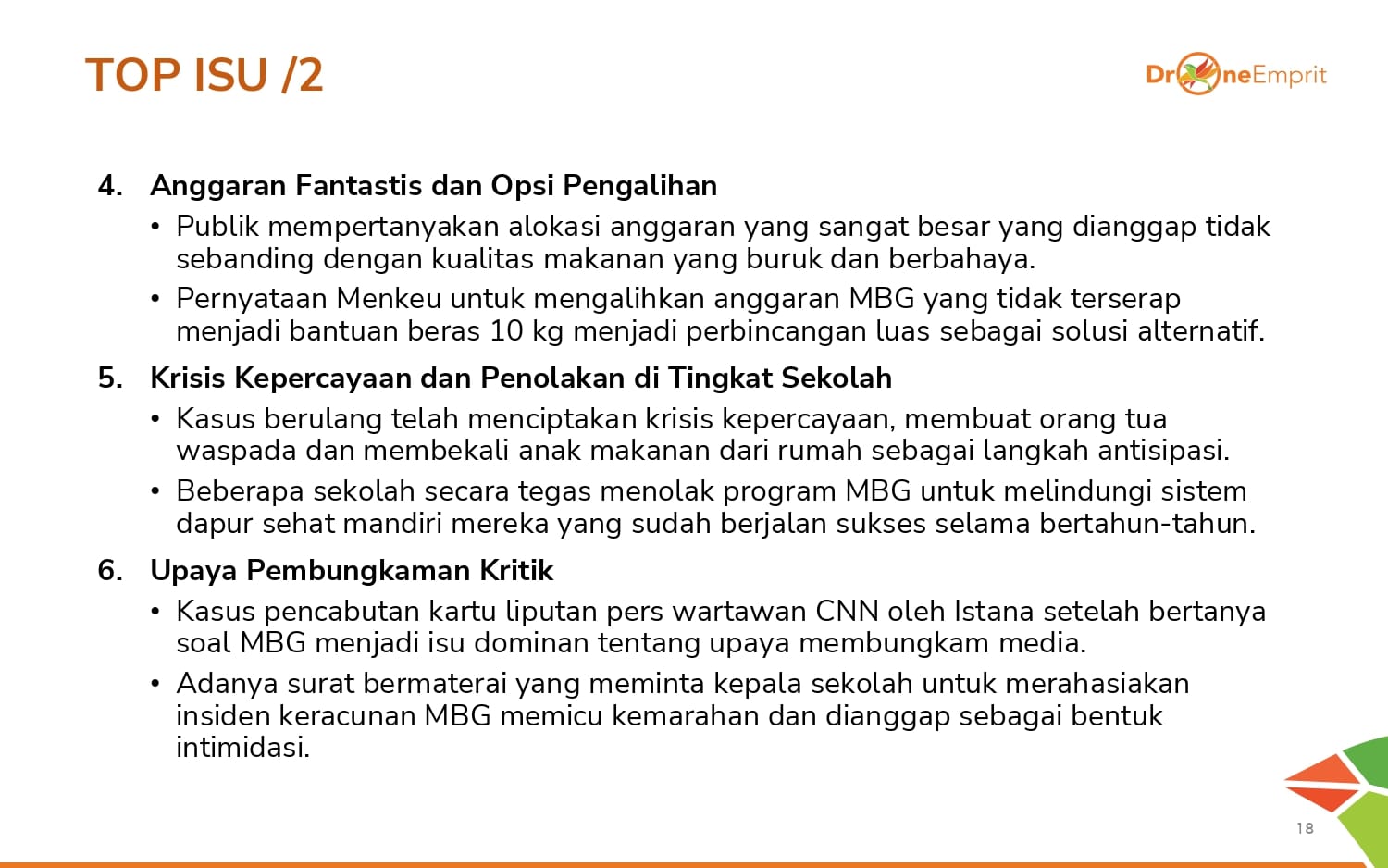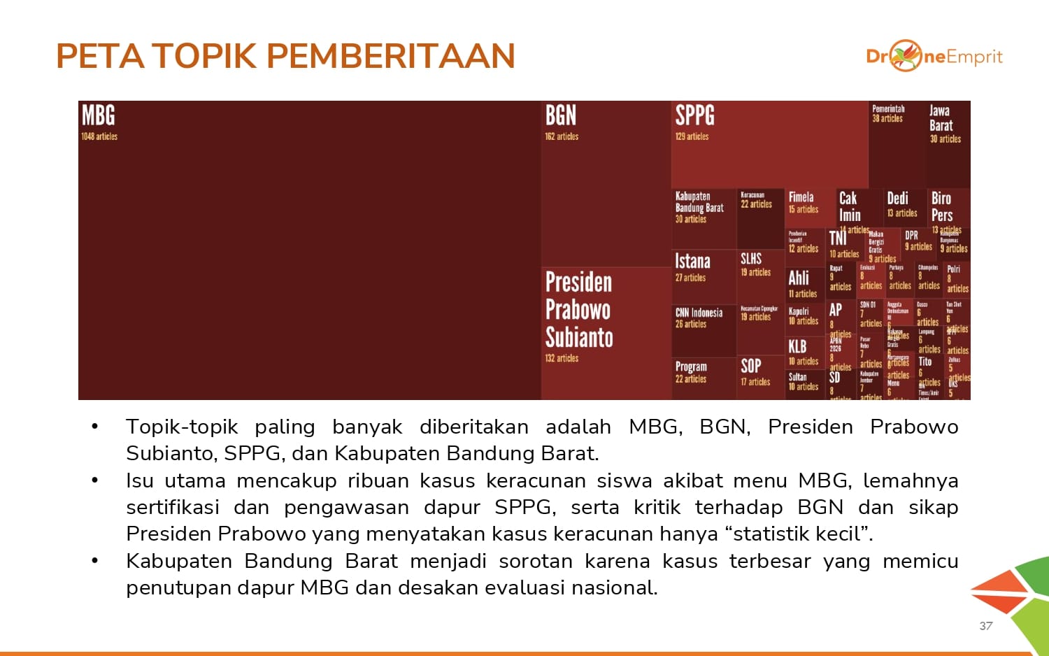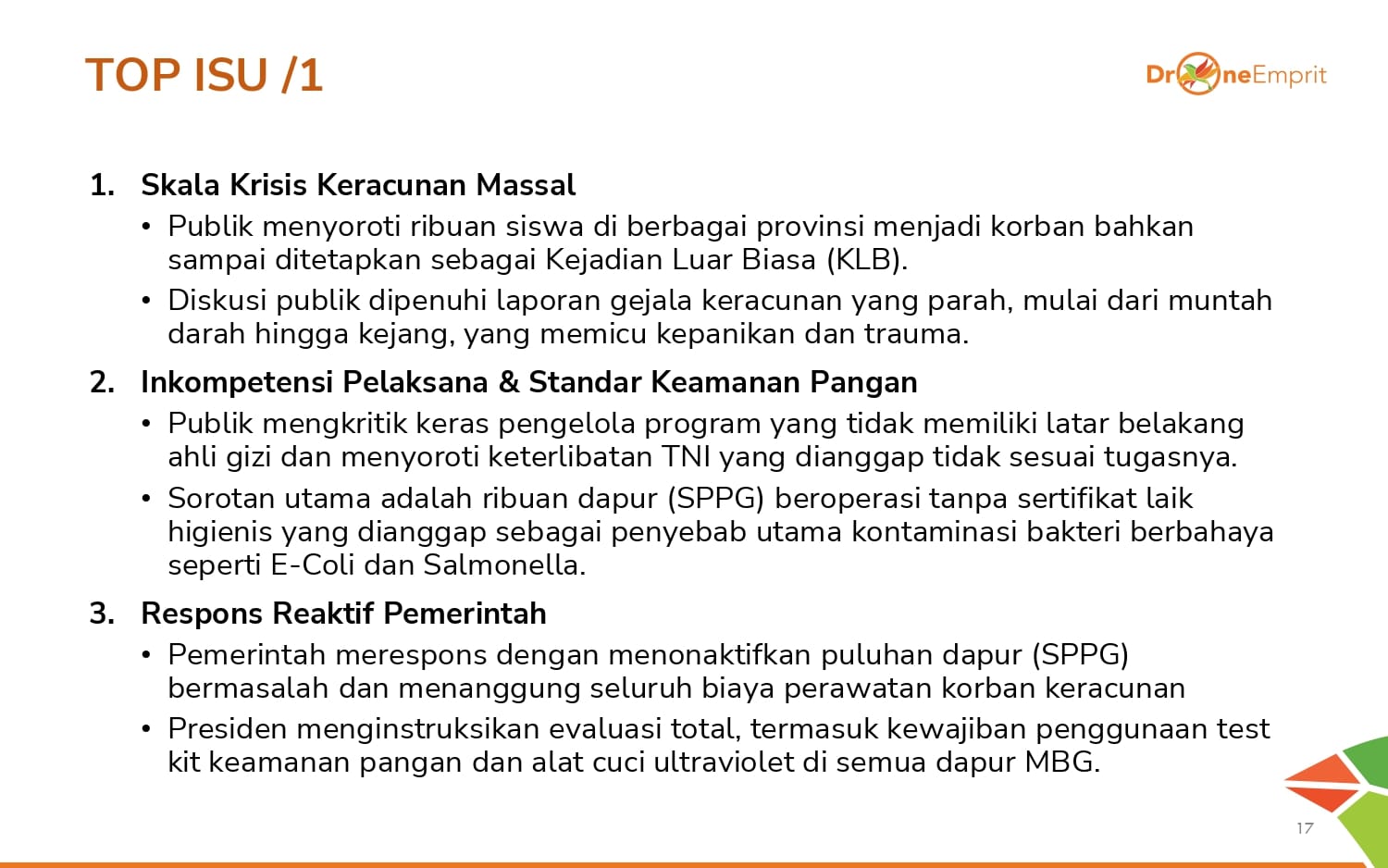 Tiga isu teratas adalah skala krisis keracunan massal yang ditetapkan sebagai KLB, inkompetensi pelaksana program (dapur tak bersertifikat), dan respons reaktif pemerintah yang dinilai terlambat.