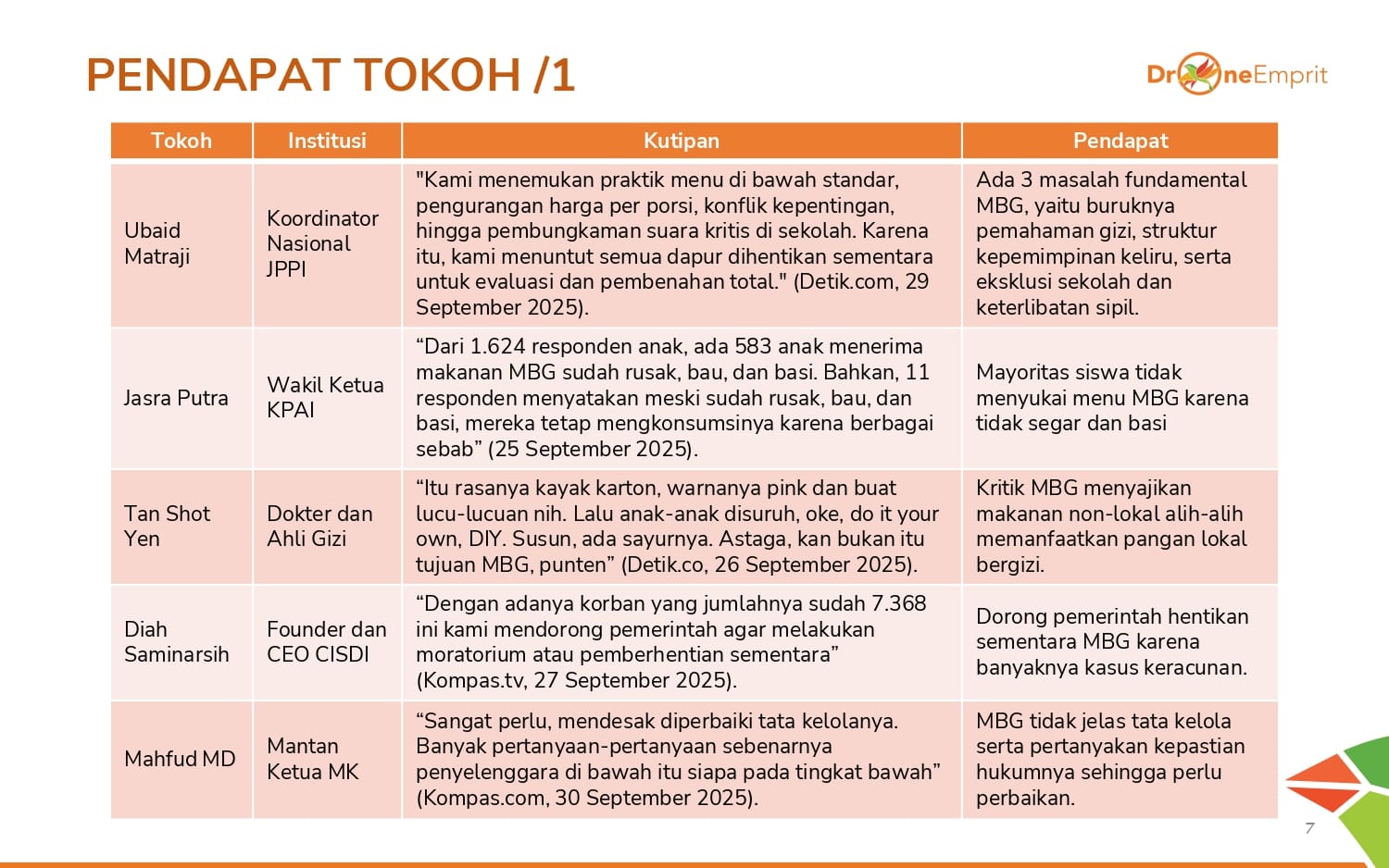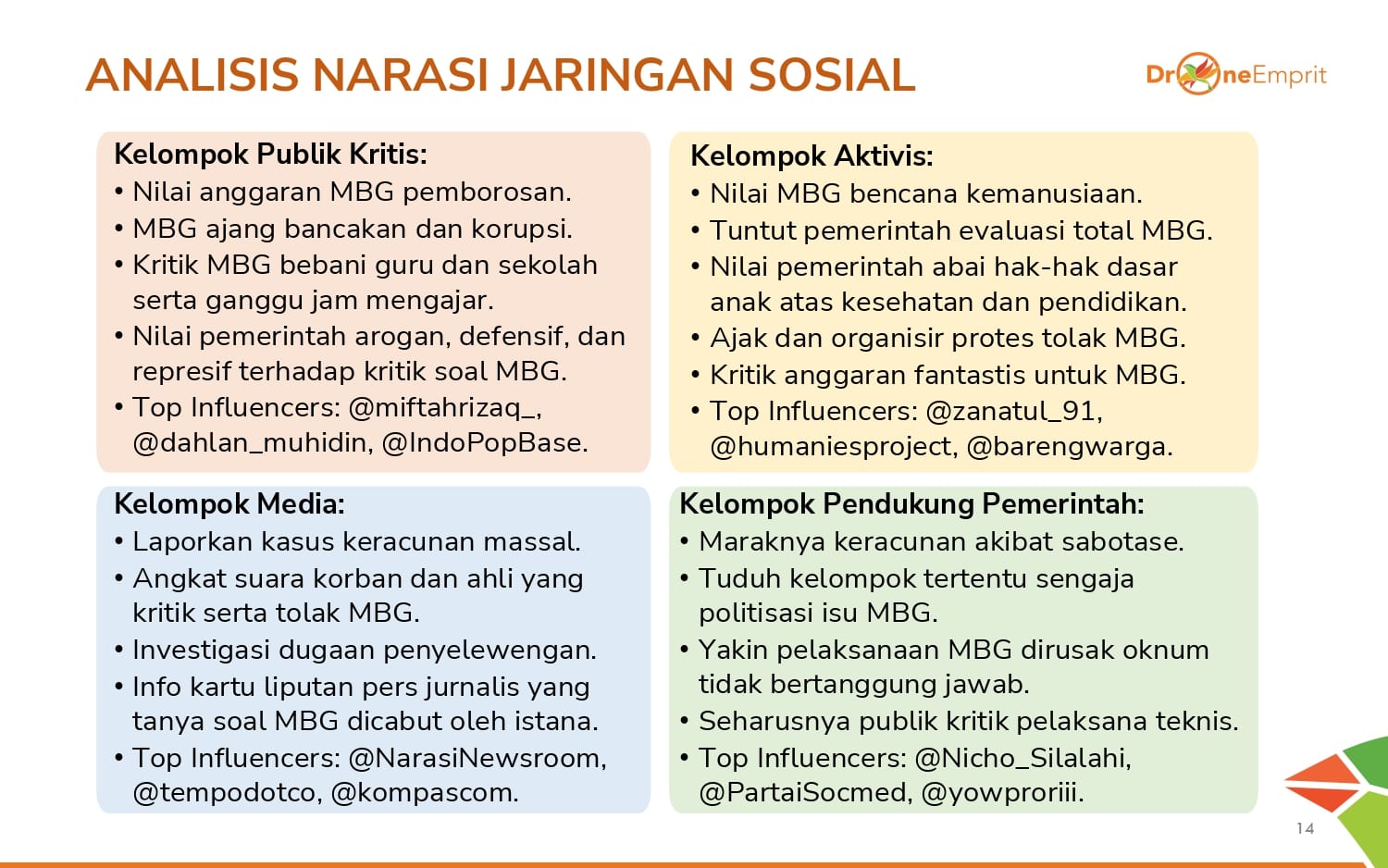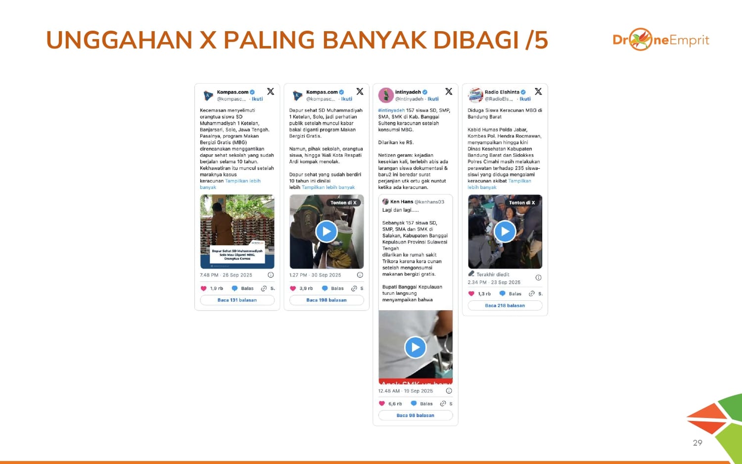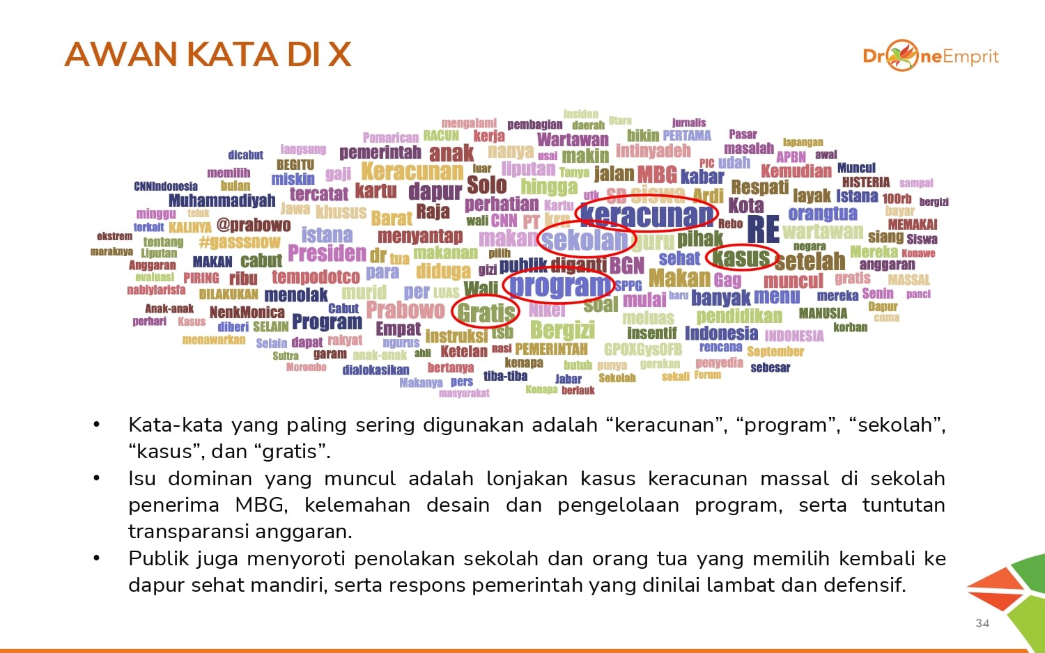 Tiga isu teratas adalah skala krisis keracunan massal yang ditetapkan sebagai KLB, inkompetensi pelaksana program (dapur tak bersertifikat), dan respons reaktif pemerintah yang dinilai terlambat.